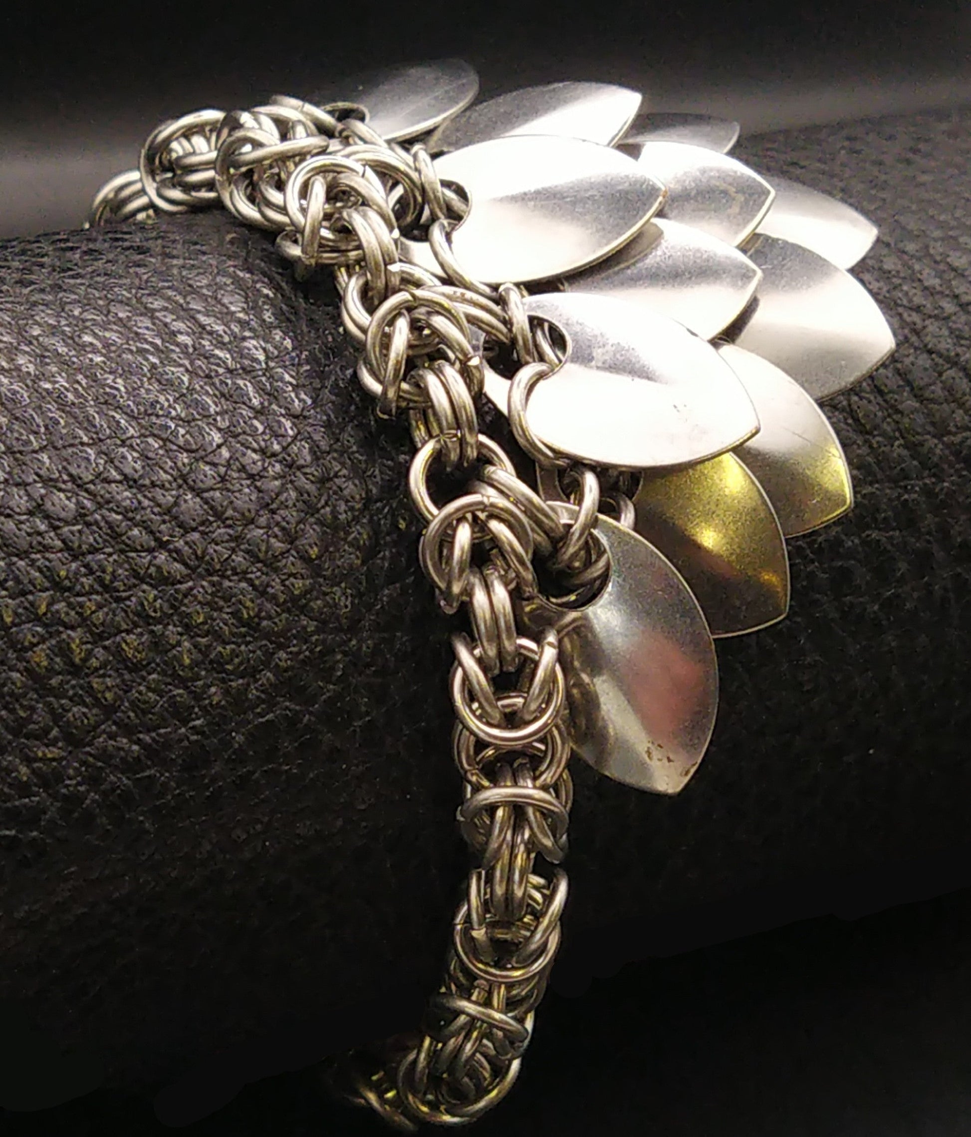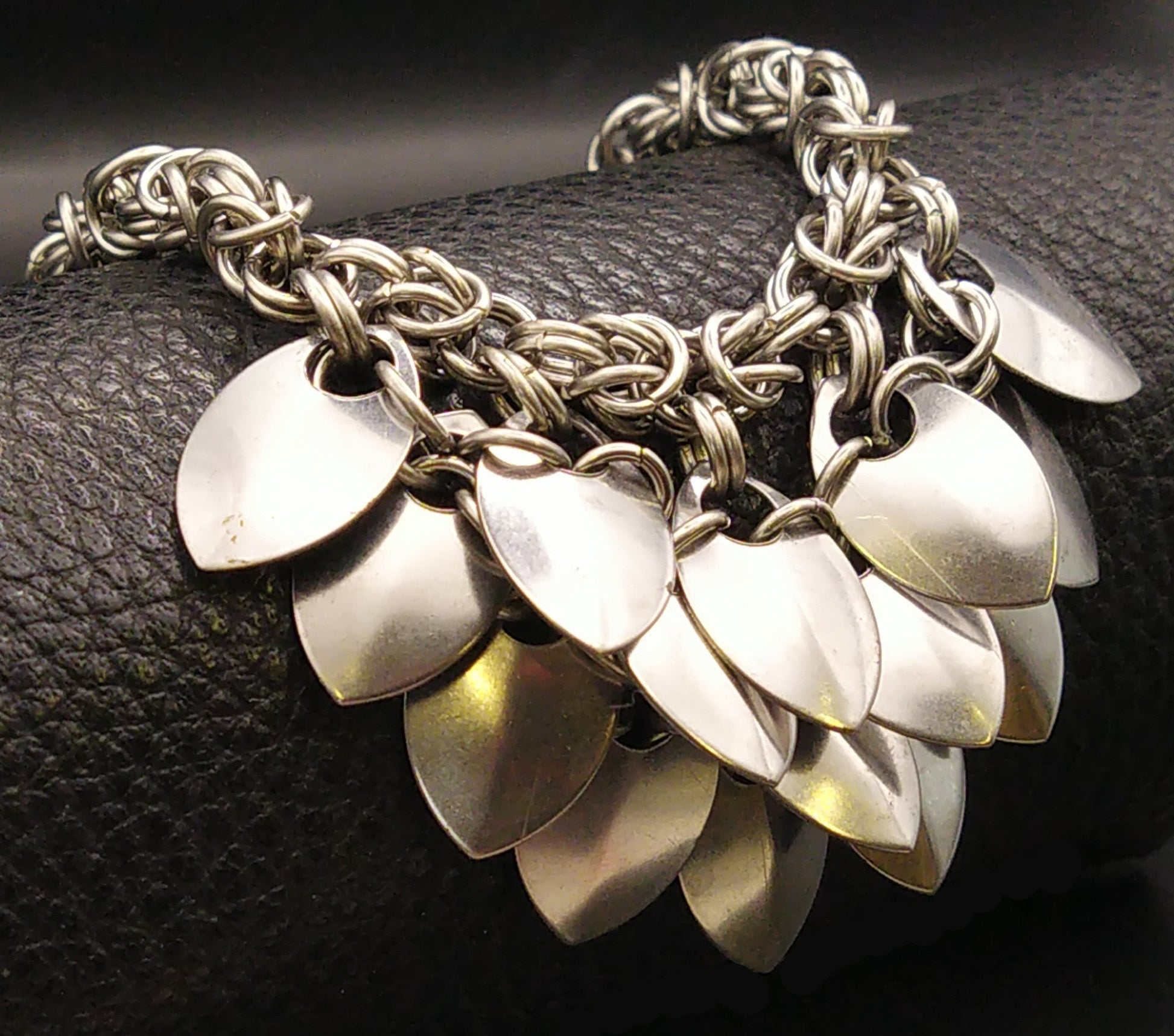 Een bijzondere enkelband gemaakt met RVS ringetjes en aluminium schubben, de enkelband is 22cm lang.