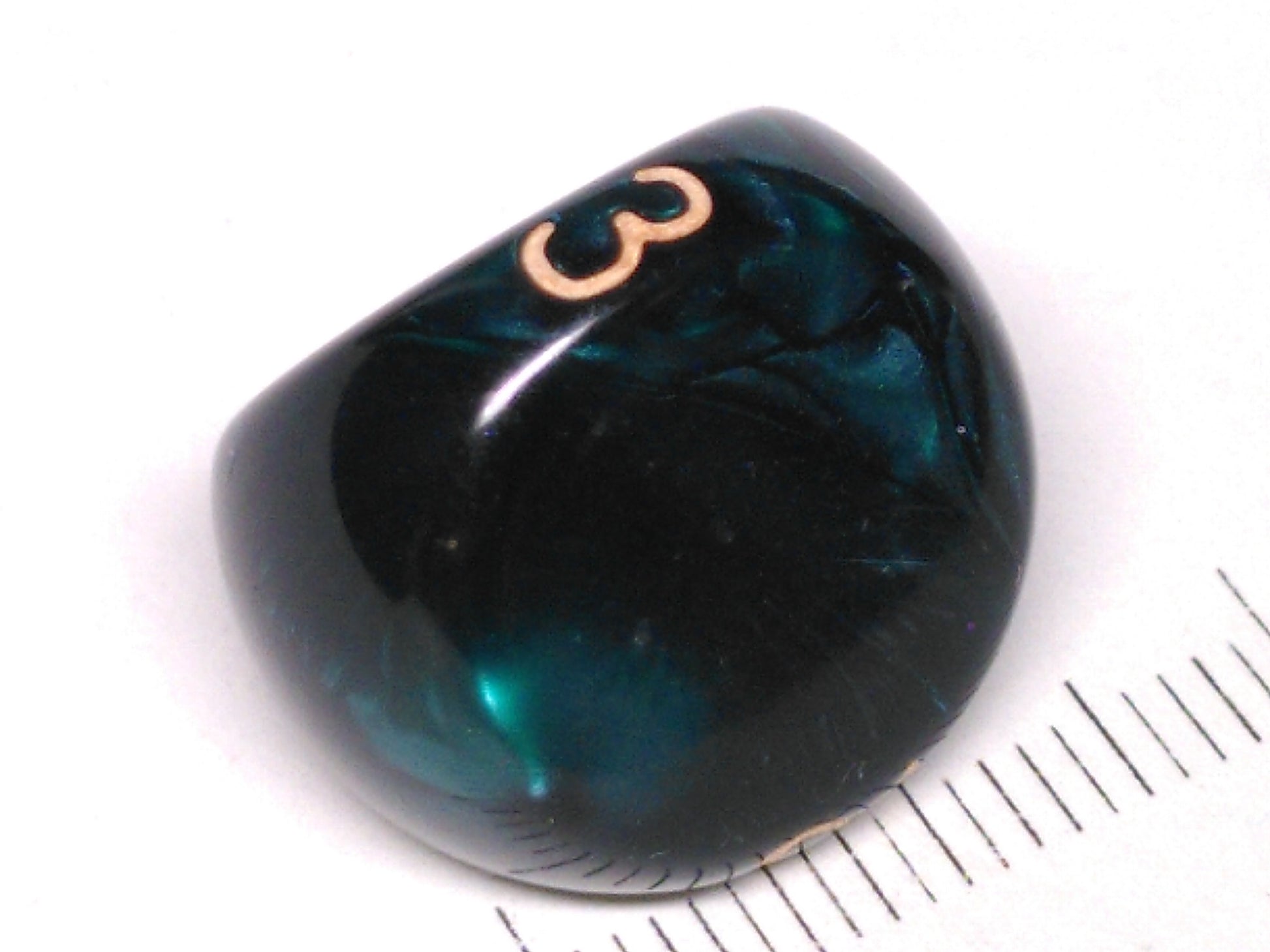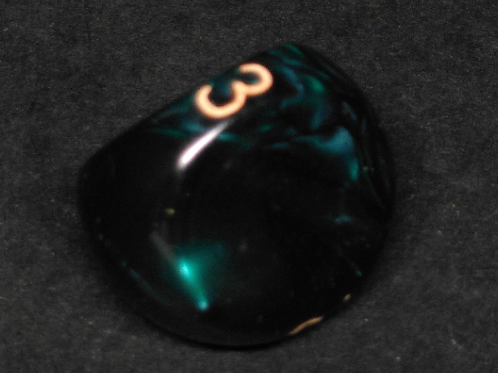 Een driezijdige dobbelsteen, iriserend groen met goudkleurige cijfers.