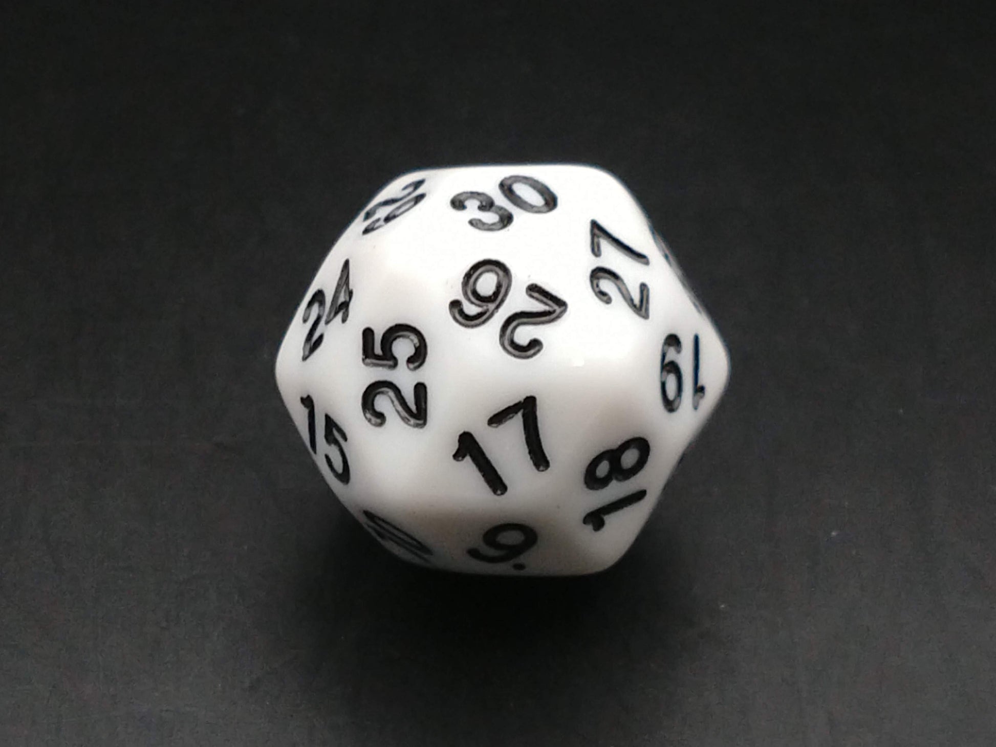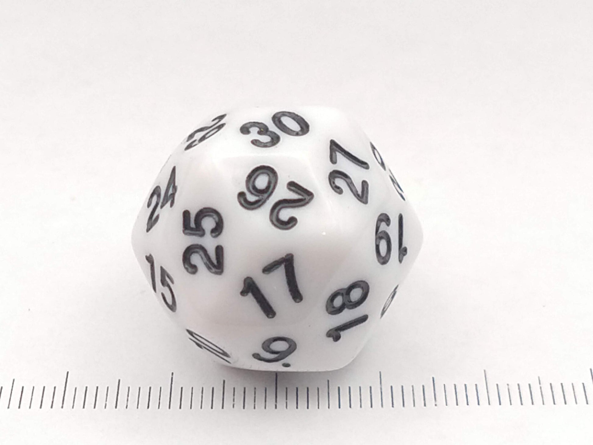 Een 30-zijdige dobbelsteen, wit met zwarte cijfers, 31mm groot.