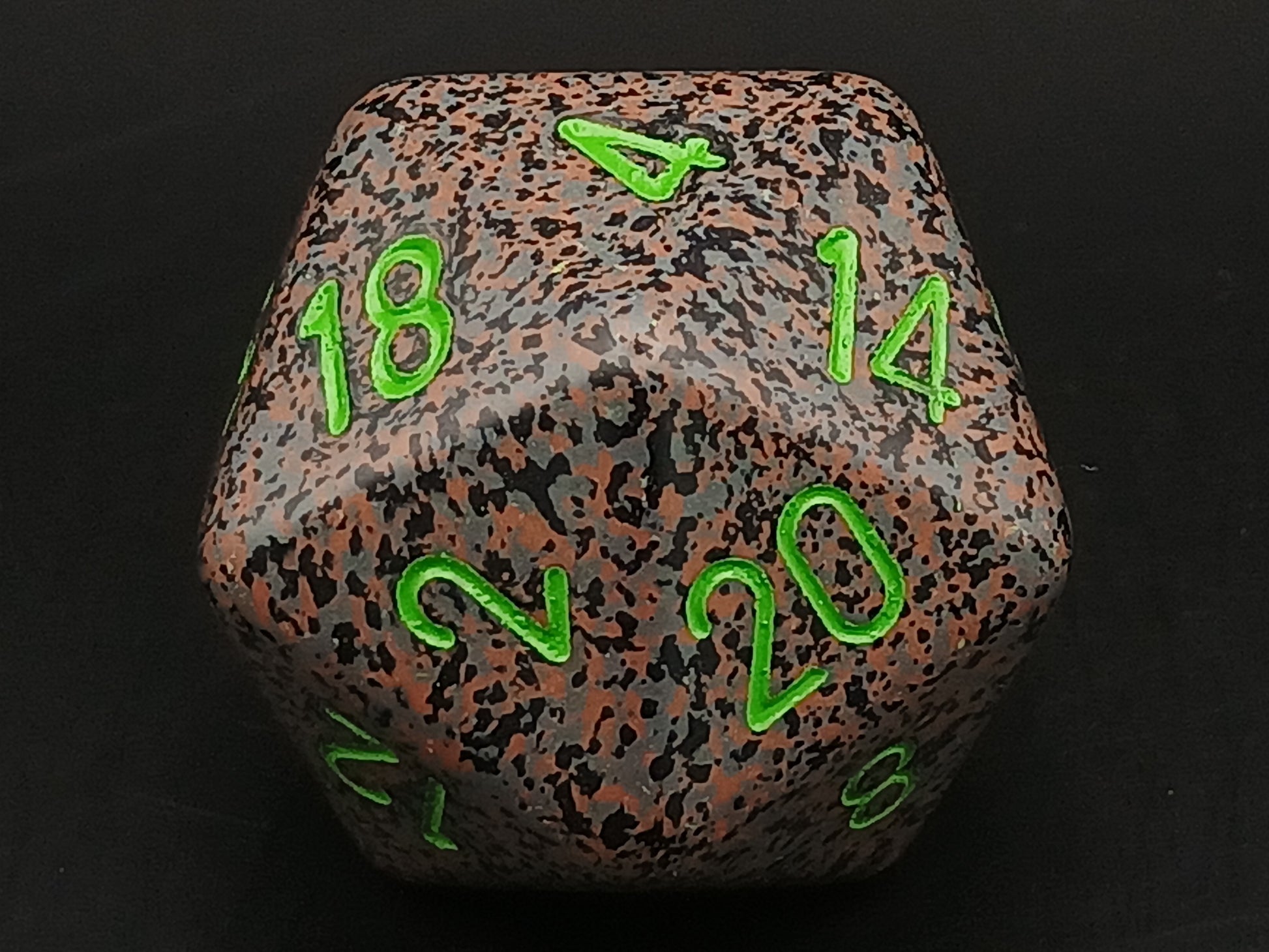 Een grote 20-zijdige Chessex dobbelstenen, bruin gespikkeld met groene opdruk.