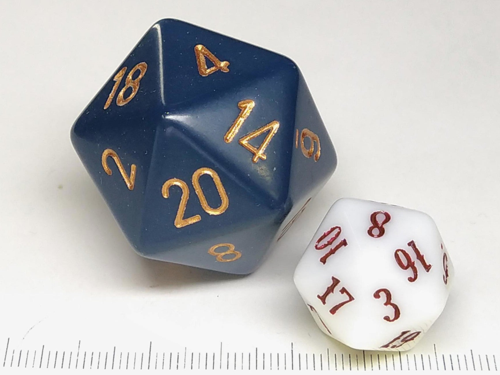 Een grote 20-zijdige Chessex dobbelstenen, effen blauw met koperkleurige opdruk.