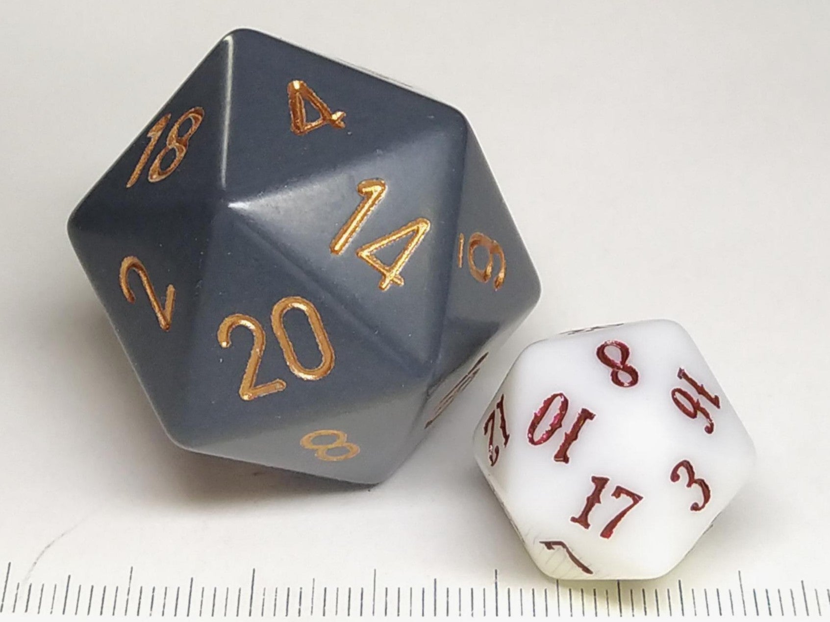 Een grote 20-zijdige Chessex dobbelstenen, effen matgrijs met koperkleurige opdruk.