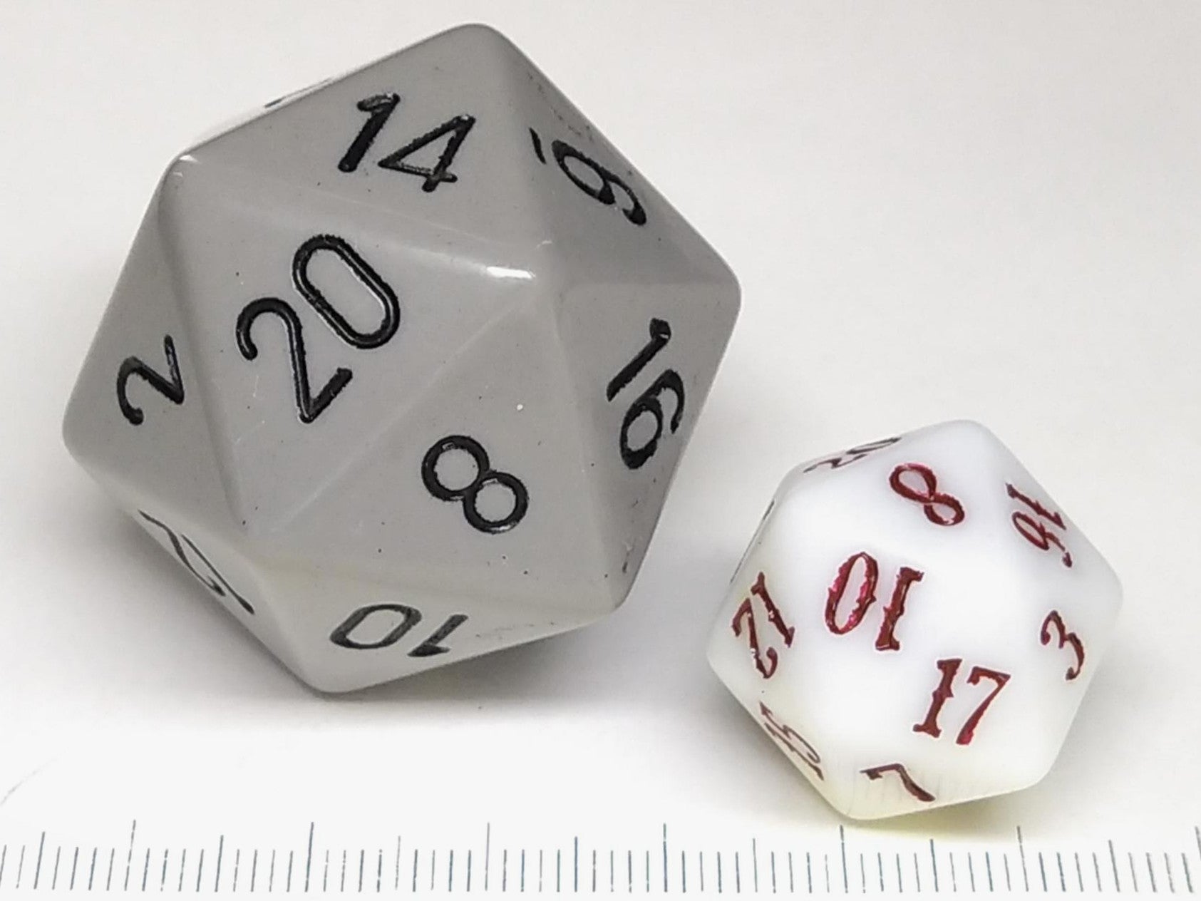 Een grote 20-zijdige Chessex dobbelstenen, effen grijs met zwarte opdruk.