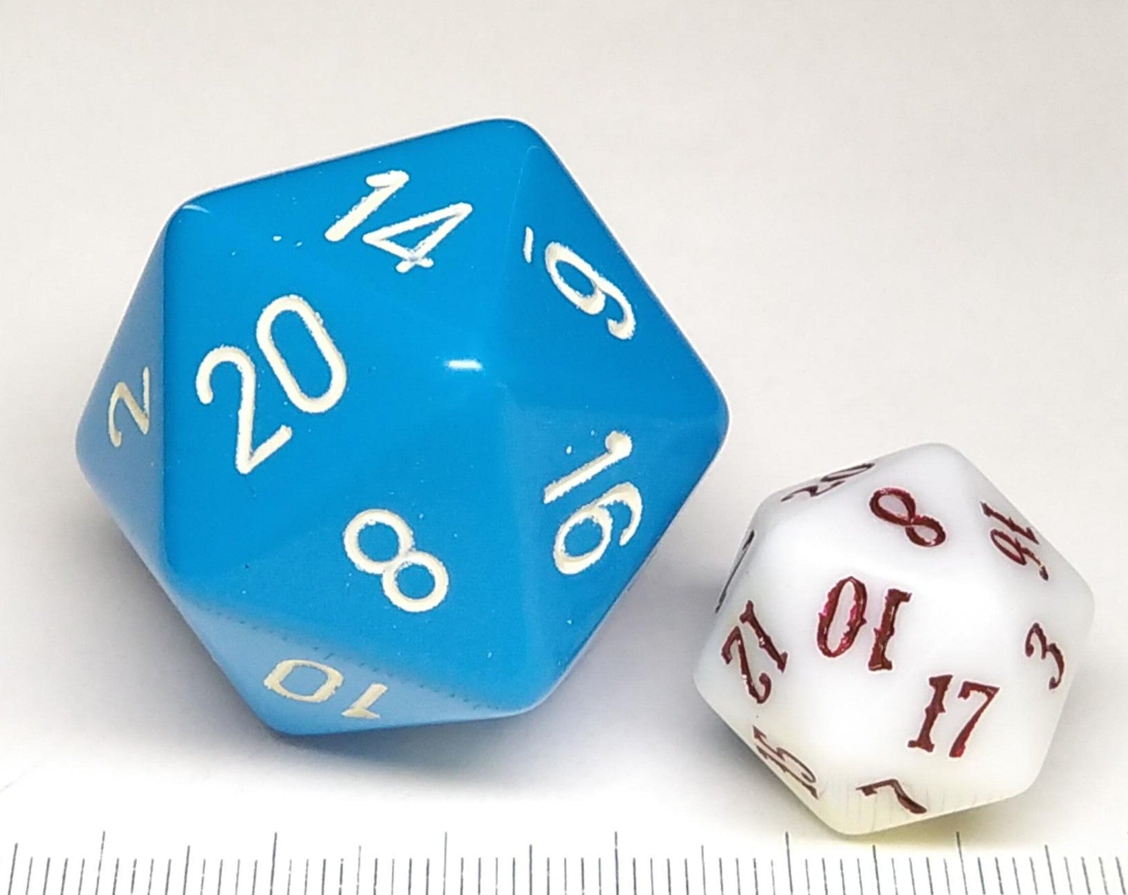 Een grote 20-zijdige Chessex dobbelstenen, effen lichtblauw met witte opdruk.