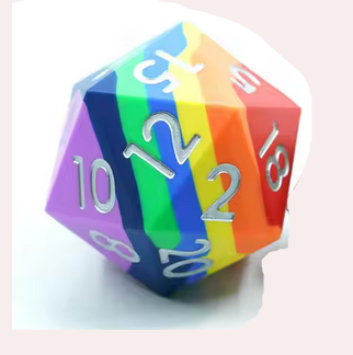 Een lekkere grote d20, in gemengde kleuren met zilverkleurige opdruk.