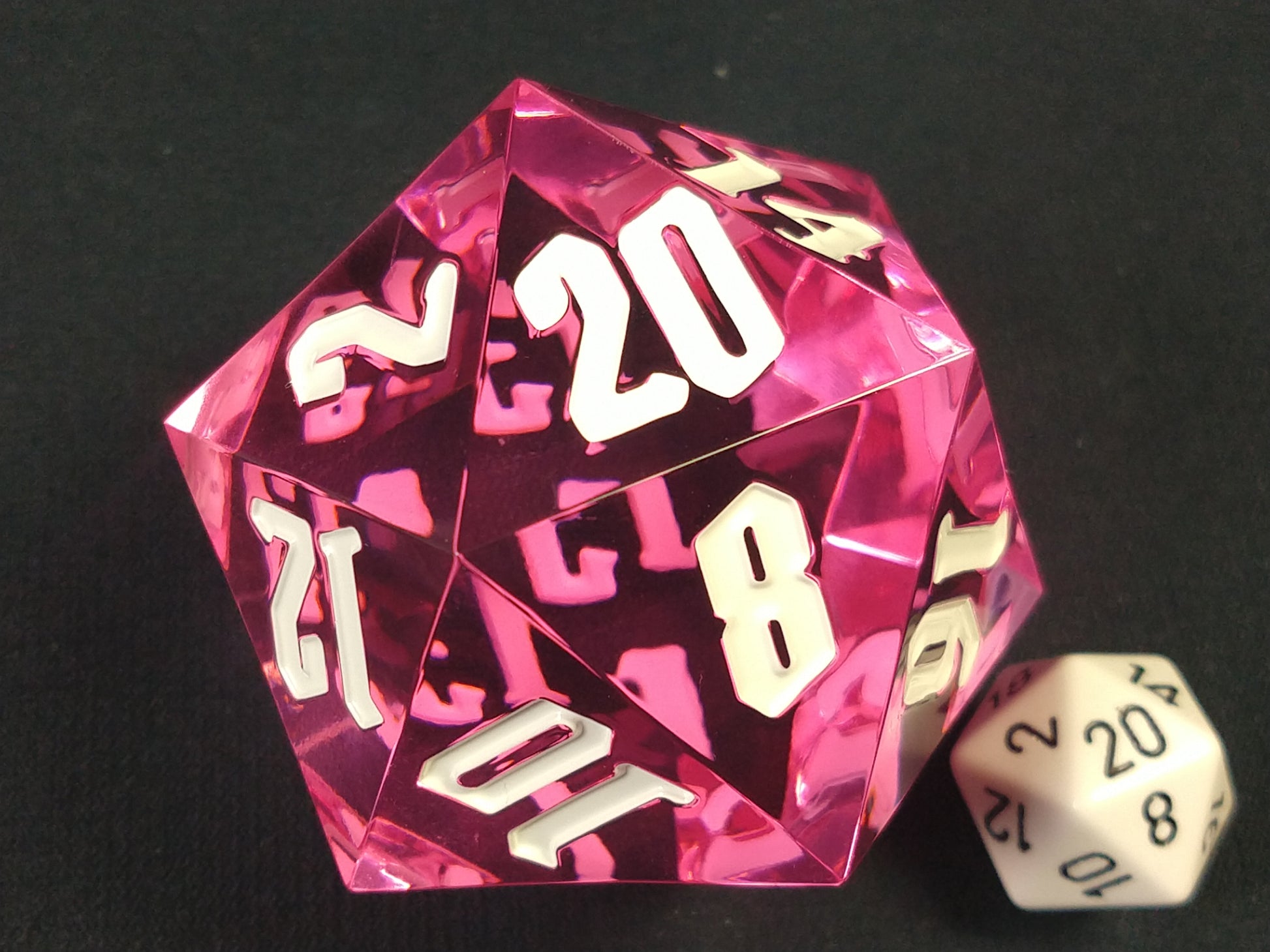 Een megagrote d20, glashelder roze met witte cijfers in Gotisch schrift.