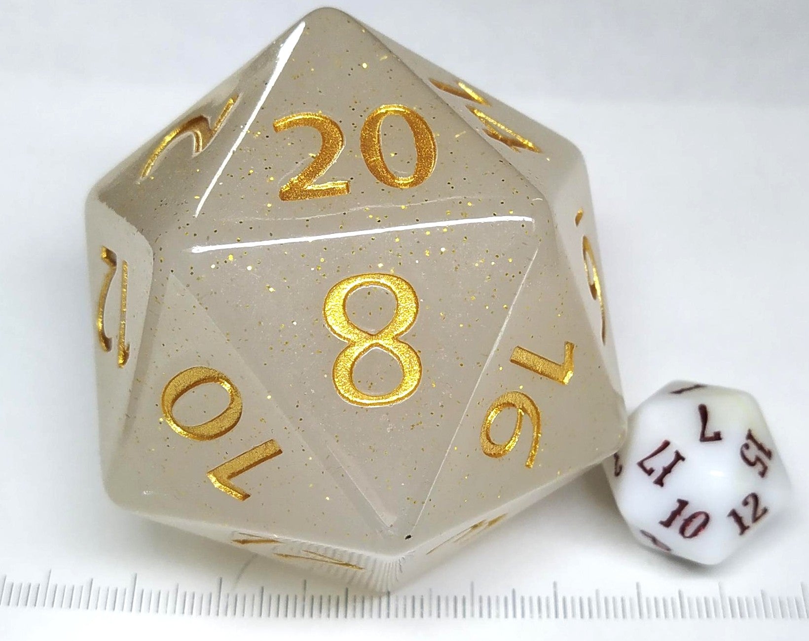 Een witte, semi-transparante 20-zijdige dobbelsteen van 55mm met goudkleurige cijfers en glitter.