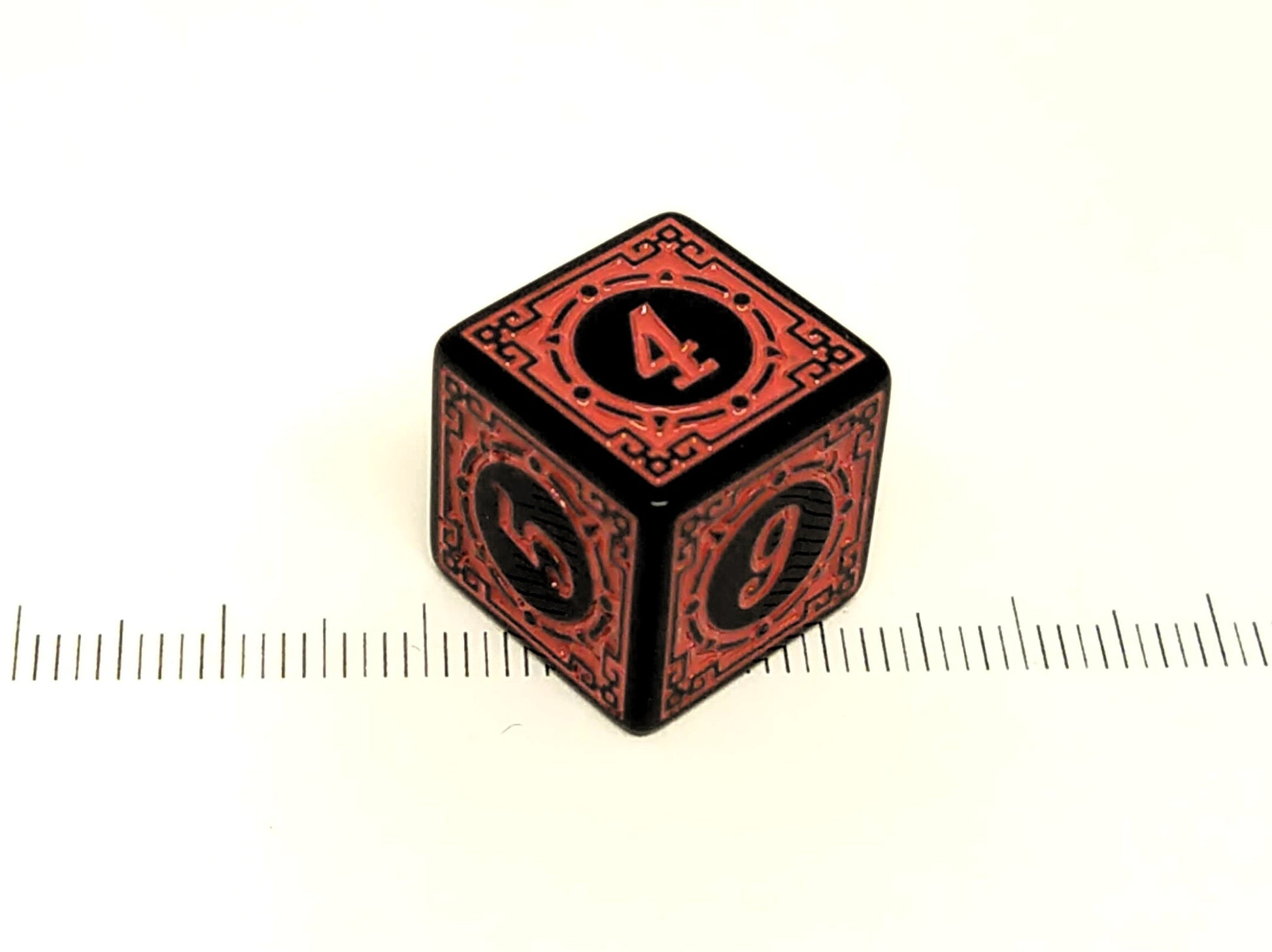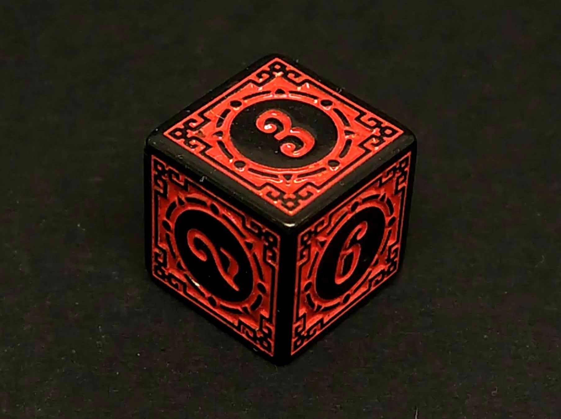 Een zwarte 6-zijdige dobbelsteen met rode in relief gedecoreerde vlakken.