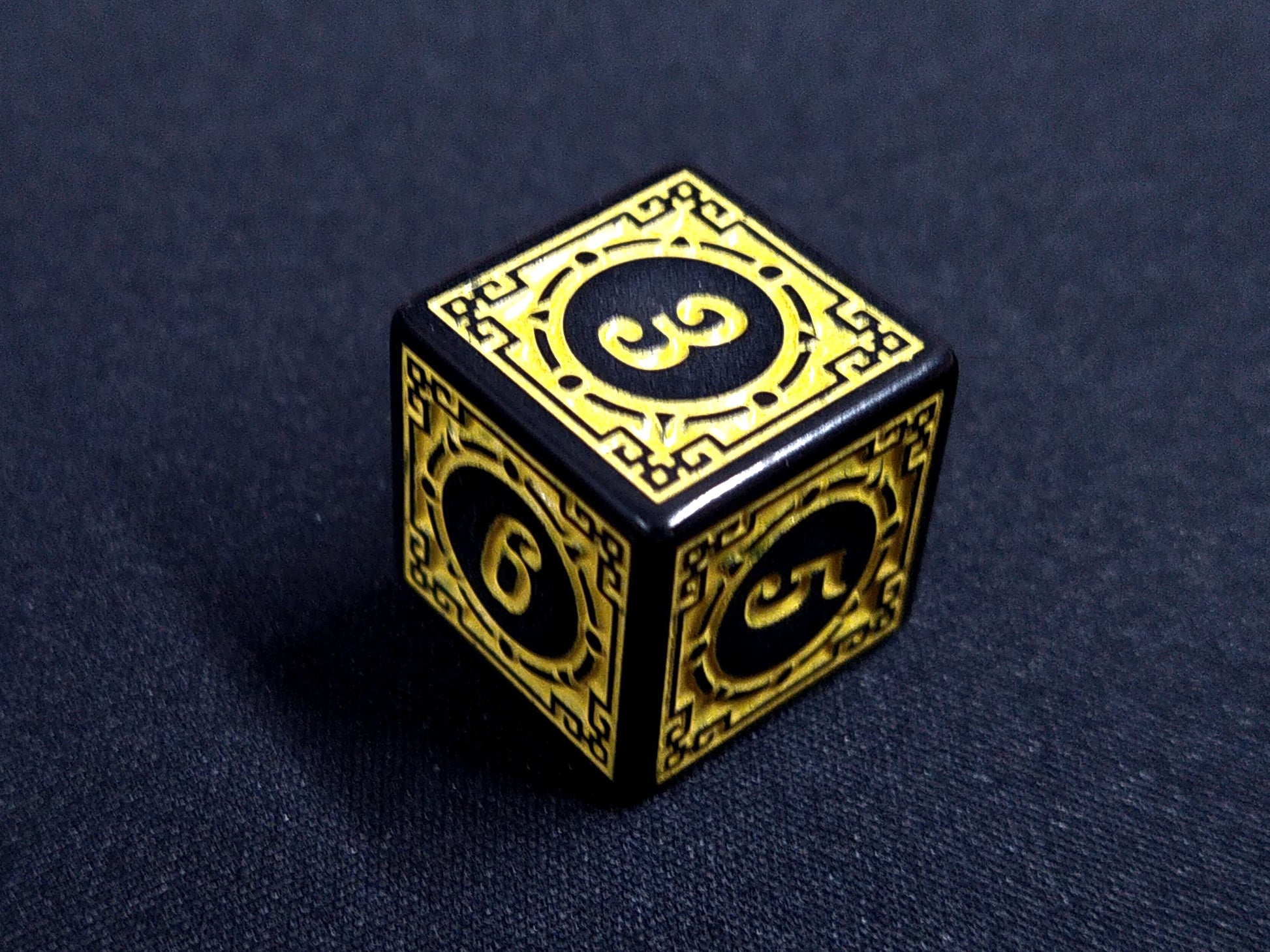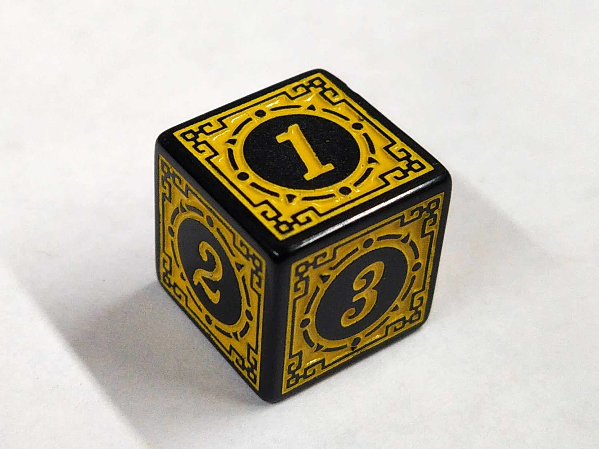 Een zwarte 6-zijdige dobbelsteen met gele in relief gedecoreerde vlakken.