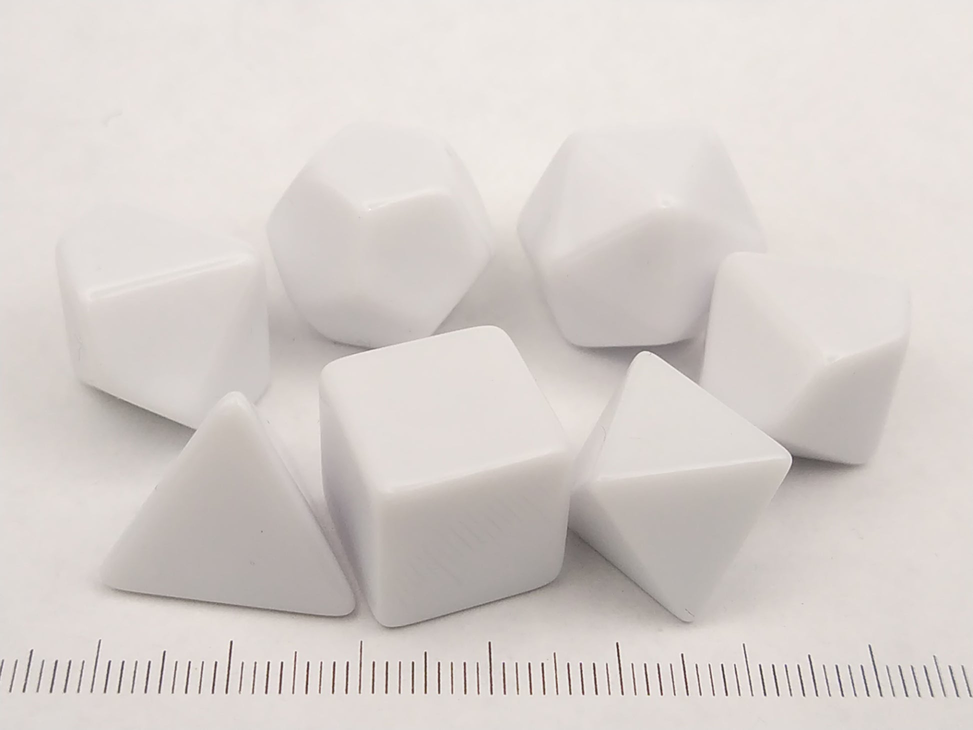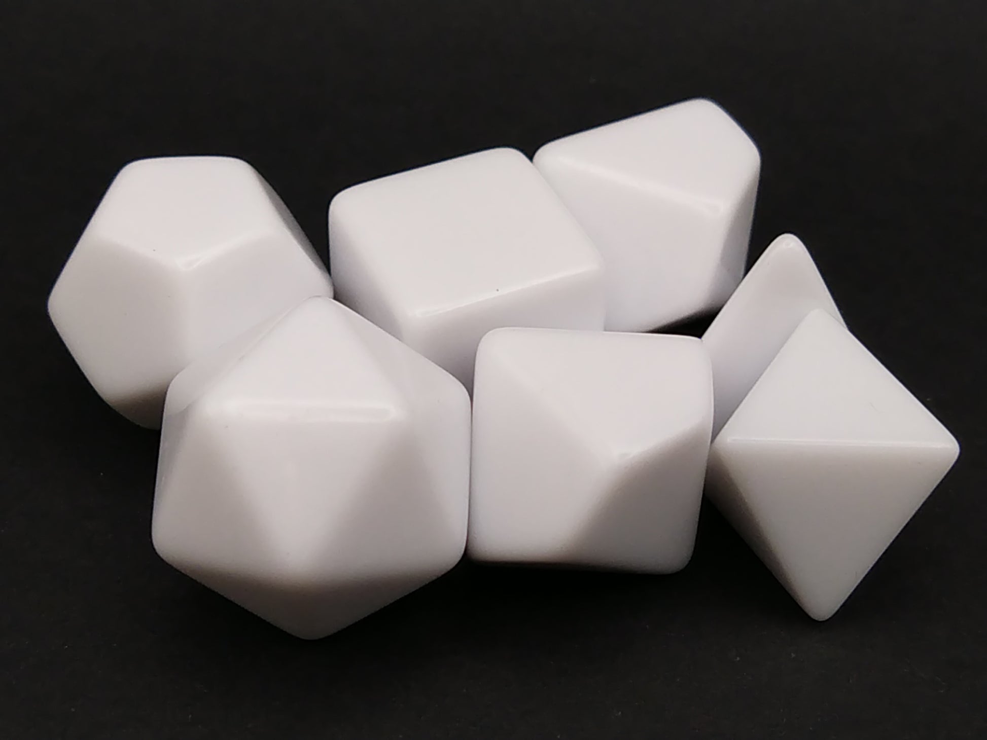 Een witte 7 delige blanco polydice set, waarop je kunt schrijven, schilderen, graveren of die je anderszins kunt versieren.