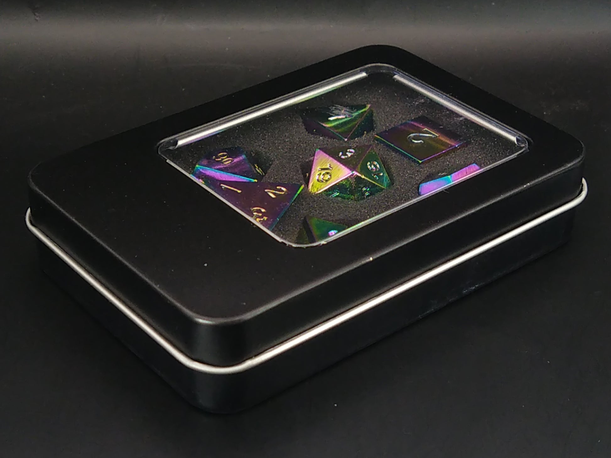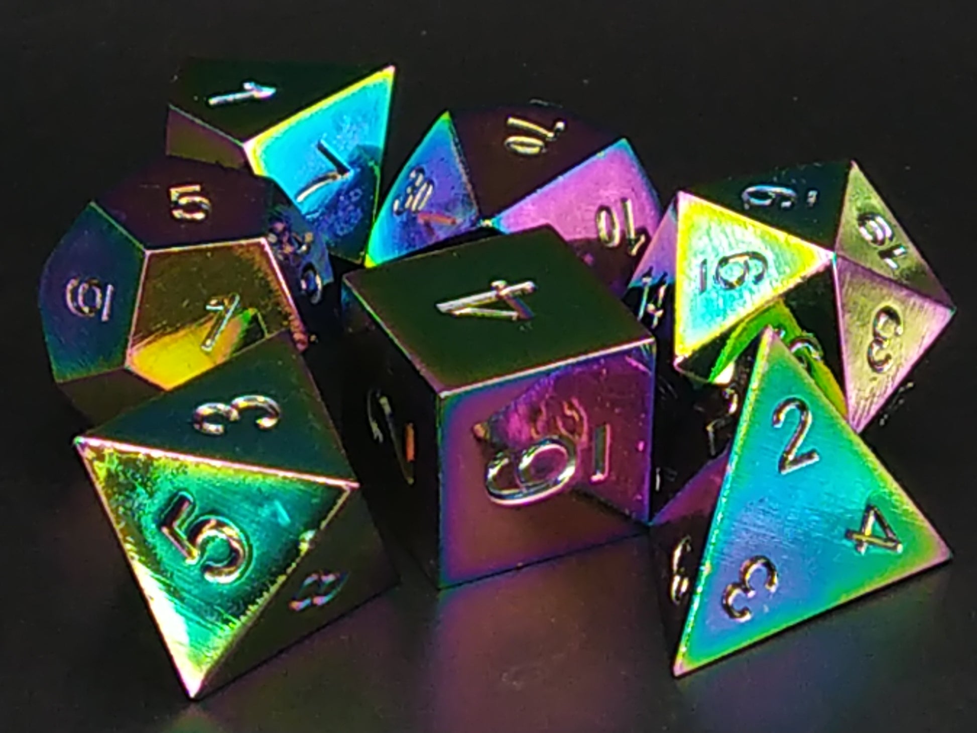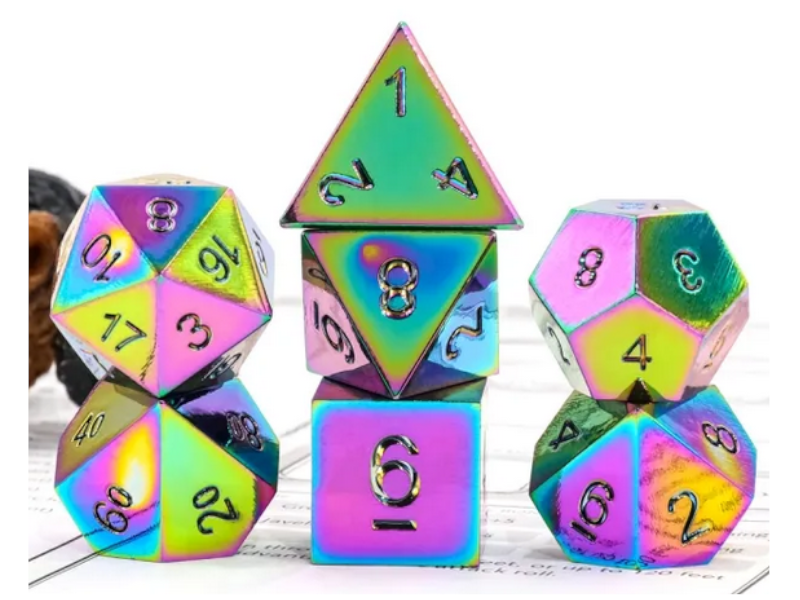Een set met 7 metalen dobbelstenen die gemengd roze, blauw, groen en geel gekleurd zijn. De cijfers zijn glimmed zilver gekleurd.