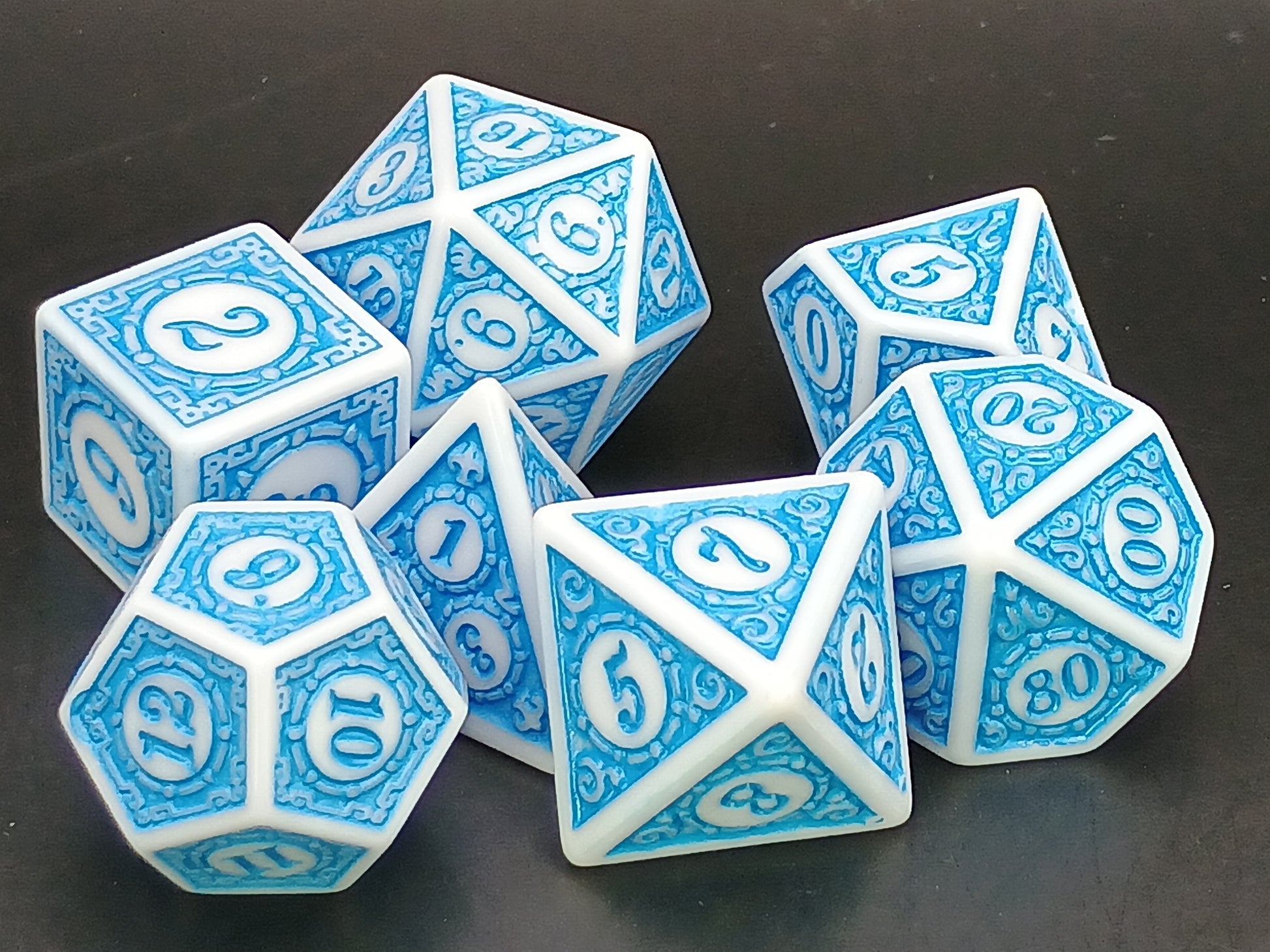 Een set witte dobbelstenen met blauwe, in relief gedecoreerde vlakken.