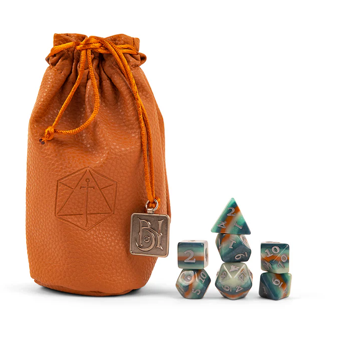 *De dobbelstenenset wordt geleverd in een lichtbruine synthetische (polyurethaan) leren tas met een Critical Role-logo in reliëf, trekkoorden en een donkerblauwe nylon voering.