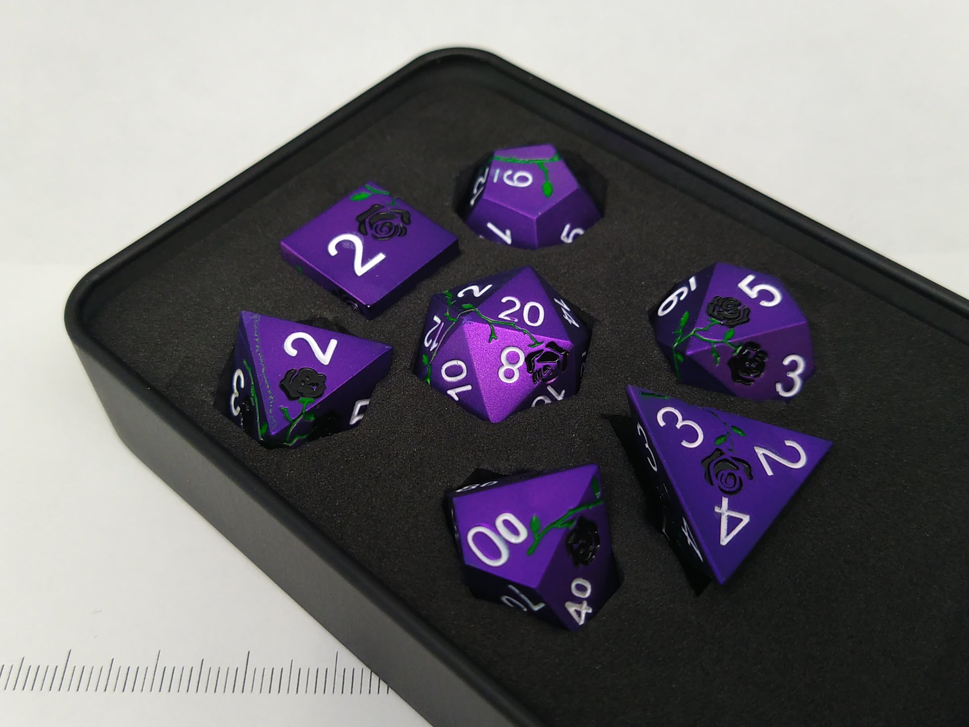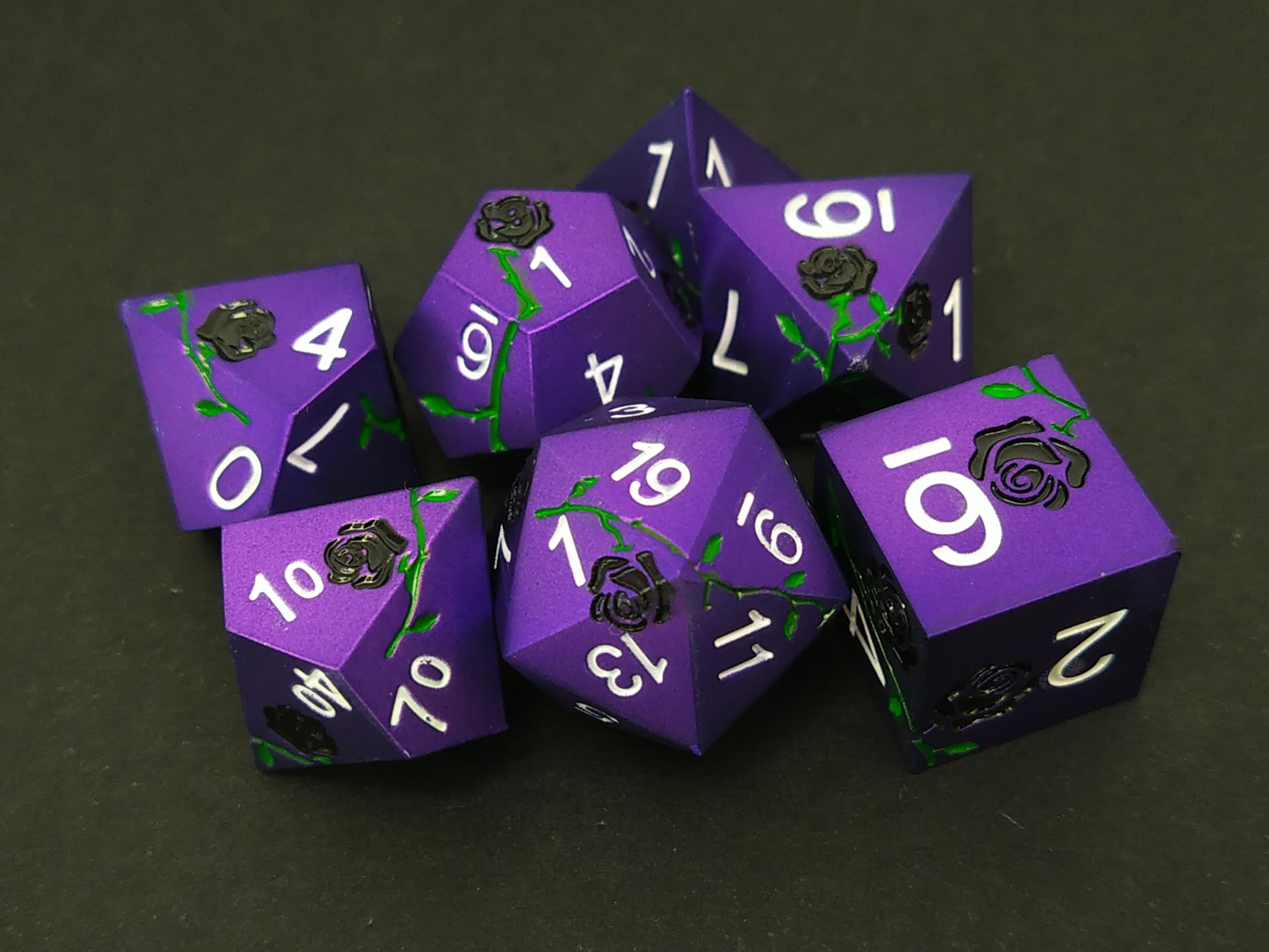 Een set van 7 paarse metalen polydice met gegraveerde rozen die zwart en groen zijn gekleurd. De set heeft witte cijfers.