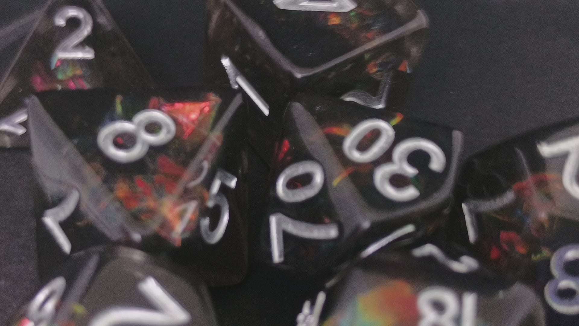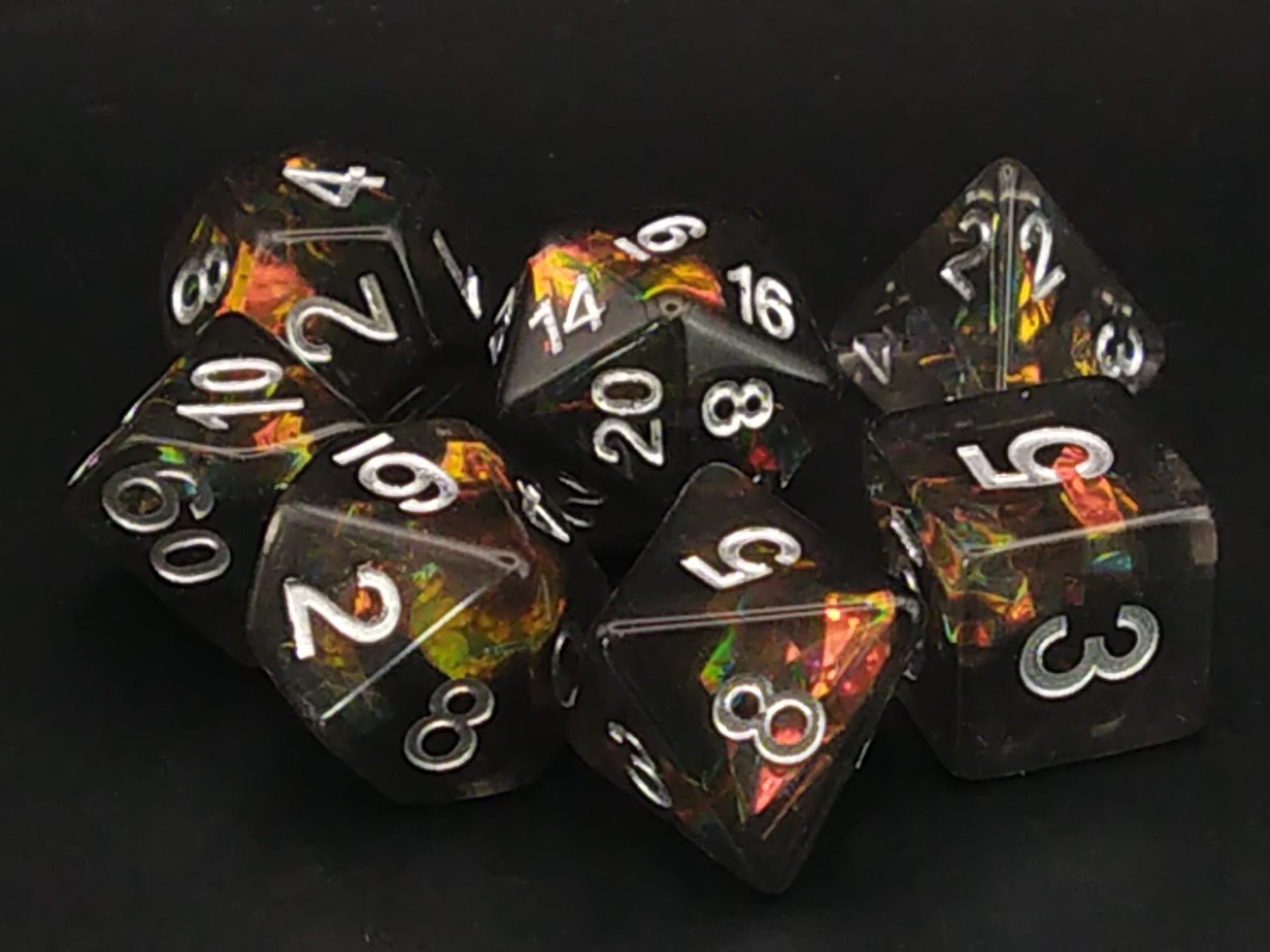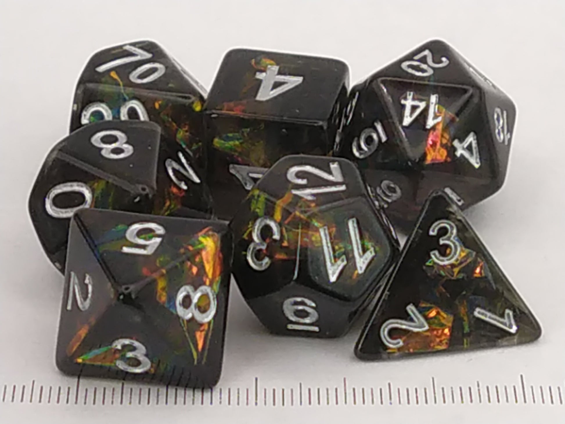 Een set van 7 semi-transparante zwarte dobbelstenen met meerkleurig getint holografisch folie aan de binnenkant, deze set heeft zilverkleurige cijfers.