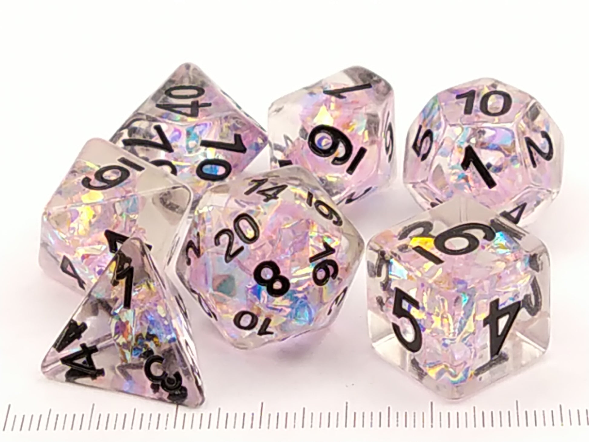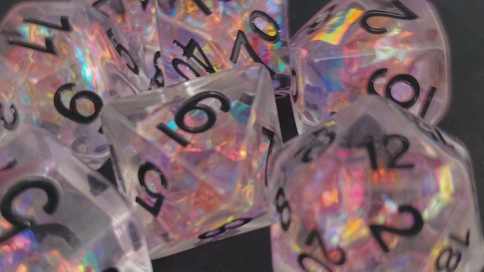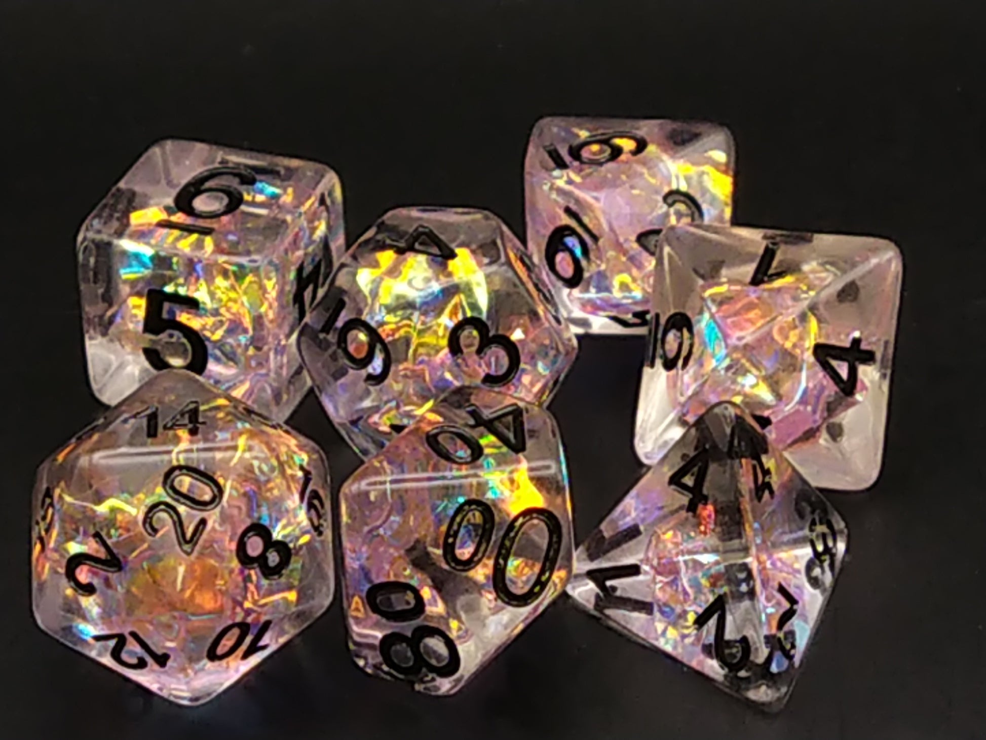Een set van 7 transparante dobbelstenen met meerkleurig paarsgetint holografisch folie aan de binnenkant, deze set heeft zwarte cijfers.