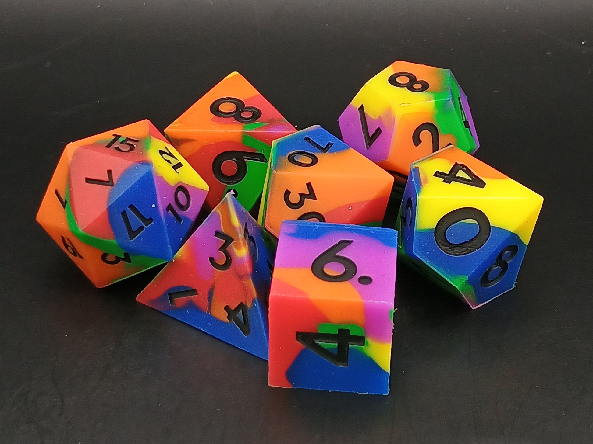 Een set siliconen polydice die iets groter is dan normaal, in gemengde felle kleuren met zwarte opdruk.
