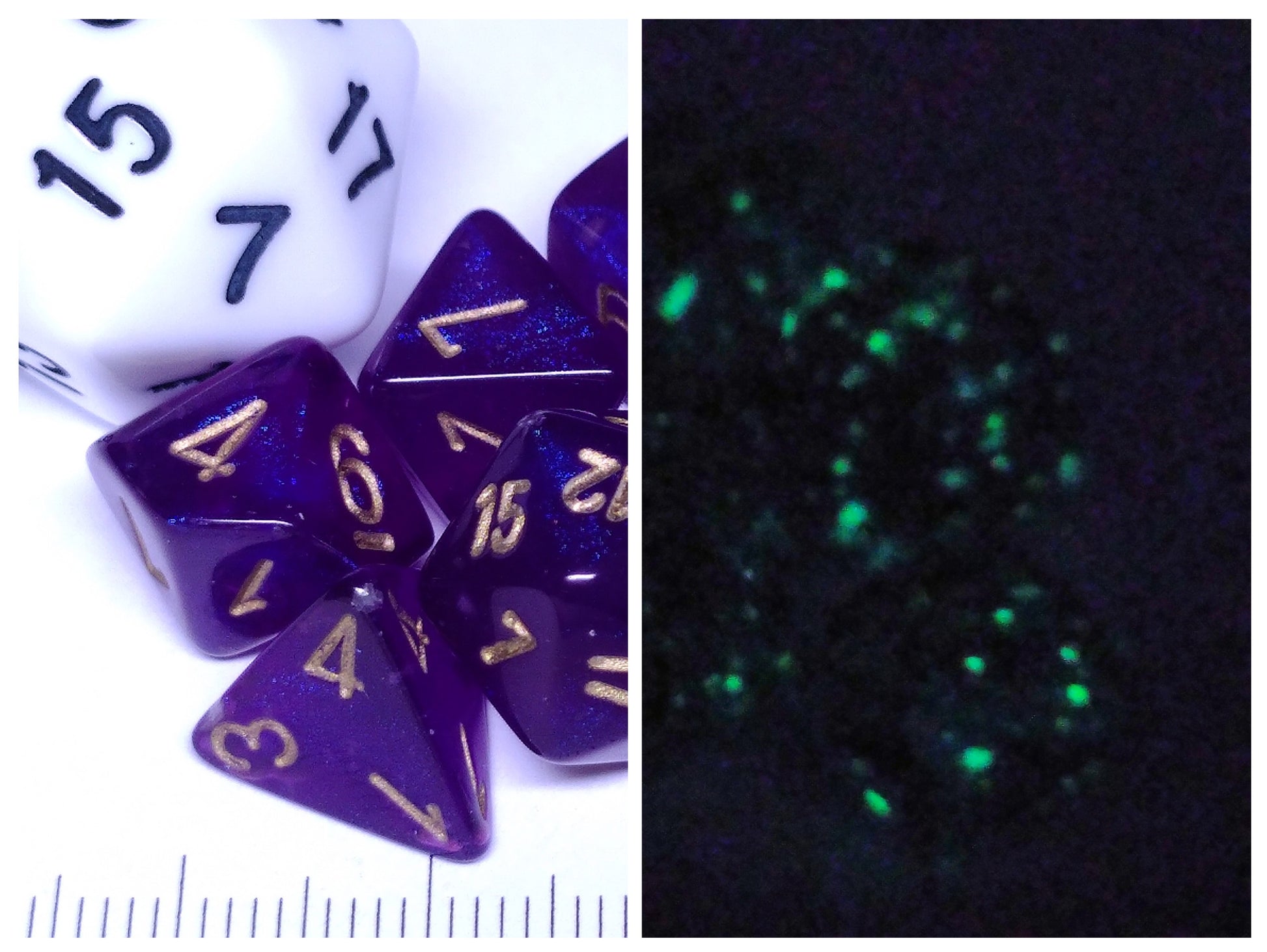 Een set van zeven mini Chessex dobbelstenen, paars met een glinsterende zweem, met goudkleurige opdruk. Deze dobbelstenen hebben lichtgevende deeltjes en gloeien op in het donker.