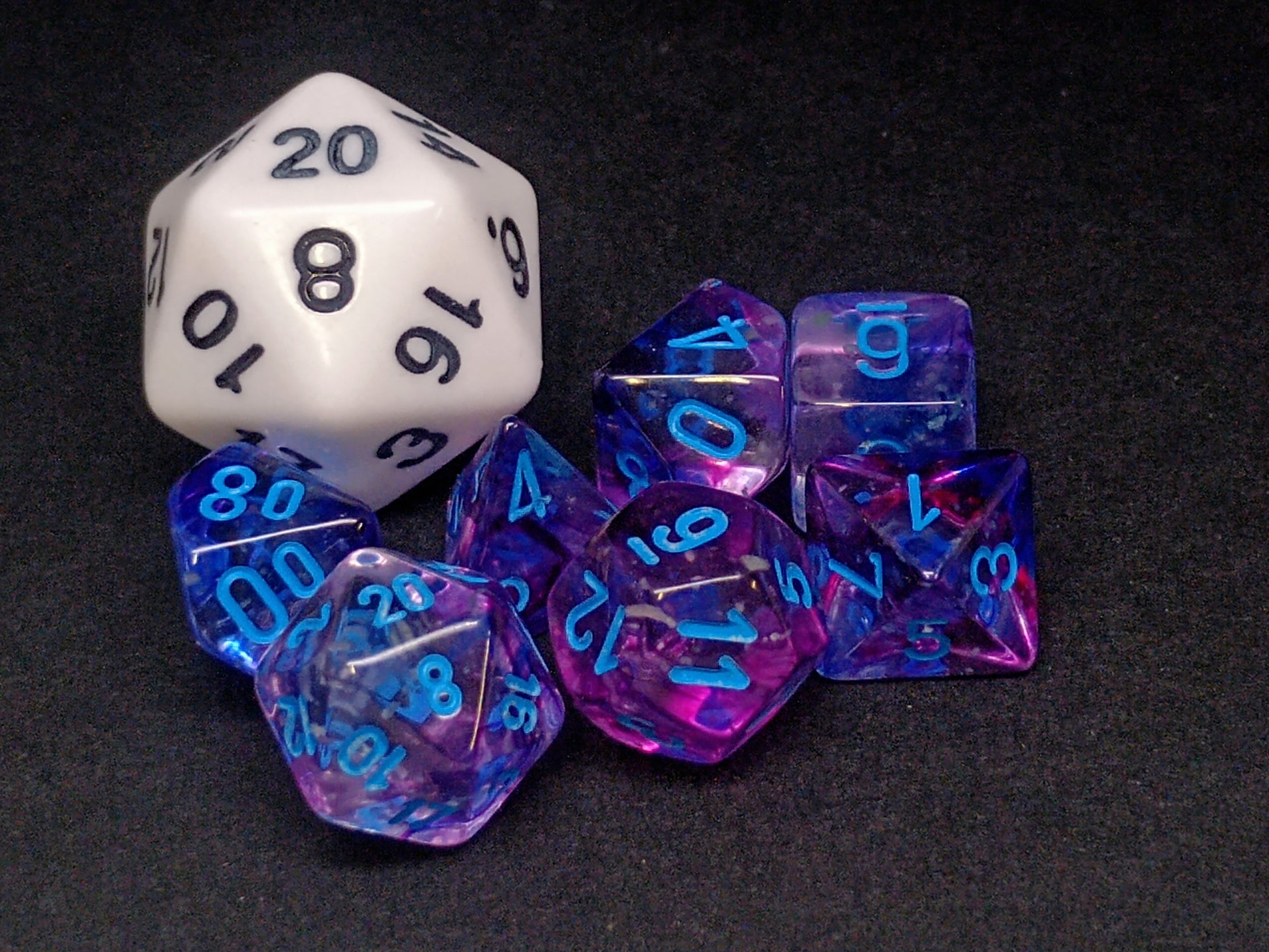 Een set van zeven mini dobbelstenen, half transparant met paarse swirls en blauwe opdruk. Deze dobbelstenen gloeien fel op in het donker, ze hebben slechts een klein beetje zonlicht nodig om op te laden en glitteren je handen uit.