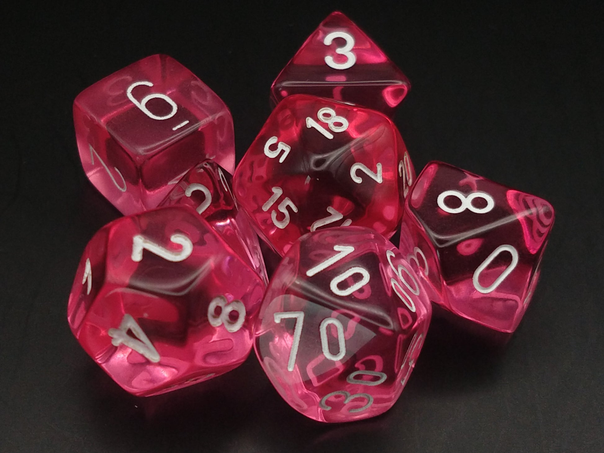 Een set van zeven dobbelstenen, transparant roze met witte opdruk.