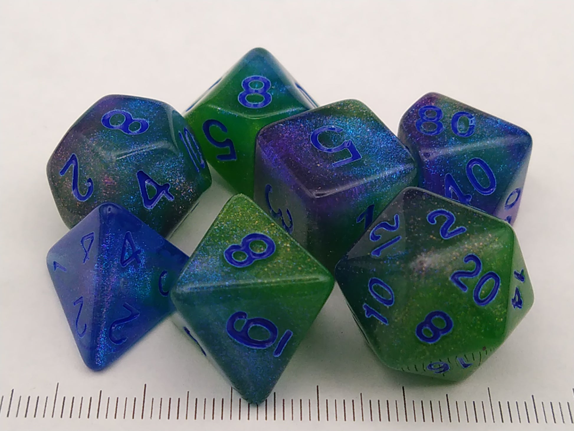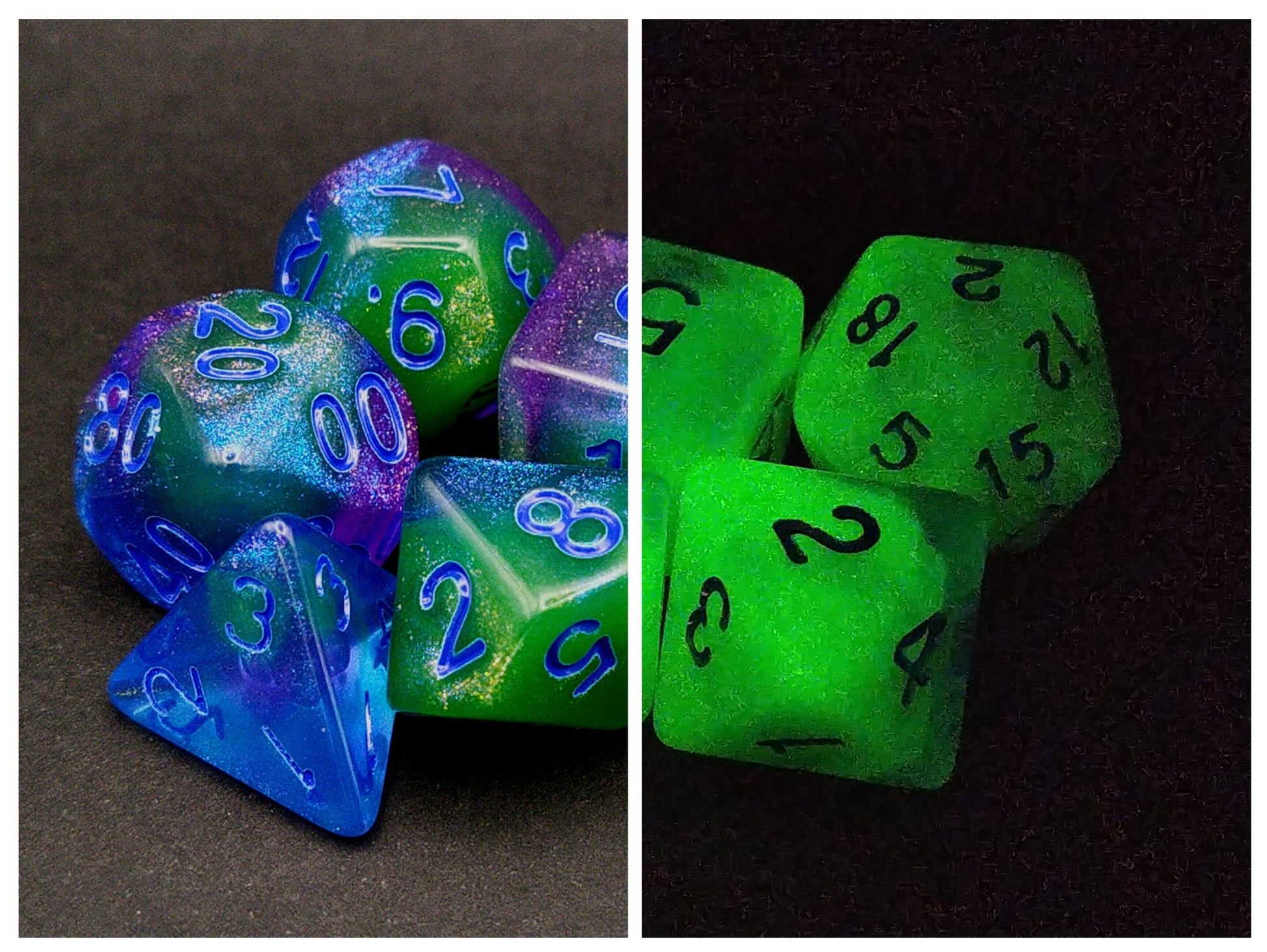 Een set polydice van twee gemarmerde kleuren - in het donker lichtgevend groen en blauw-paars met fijne blauwe glitter, met paarse cijfers.