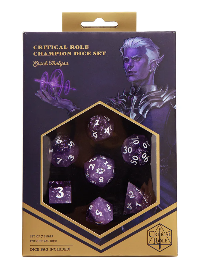 De dobbelstenenset wordt geleverd in een speciaal ontworpen doos met een venster in de vorm van een Critical Role-logo, omringd door een afbeelding van Essek die zich enthousiast inzet voor een opvallende betovering.