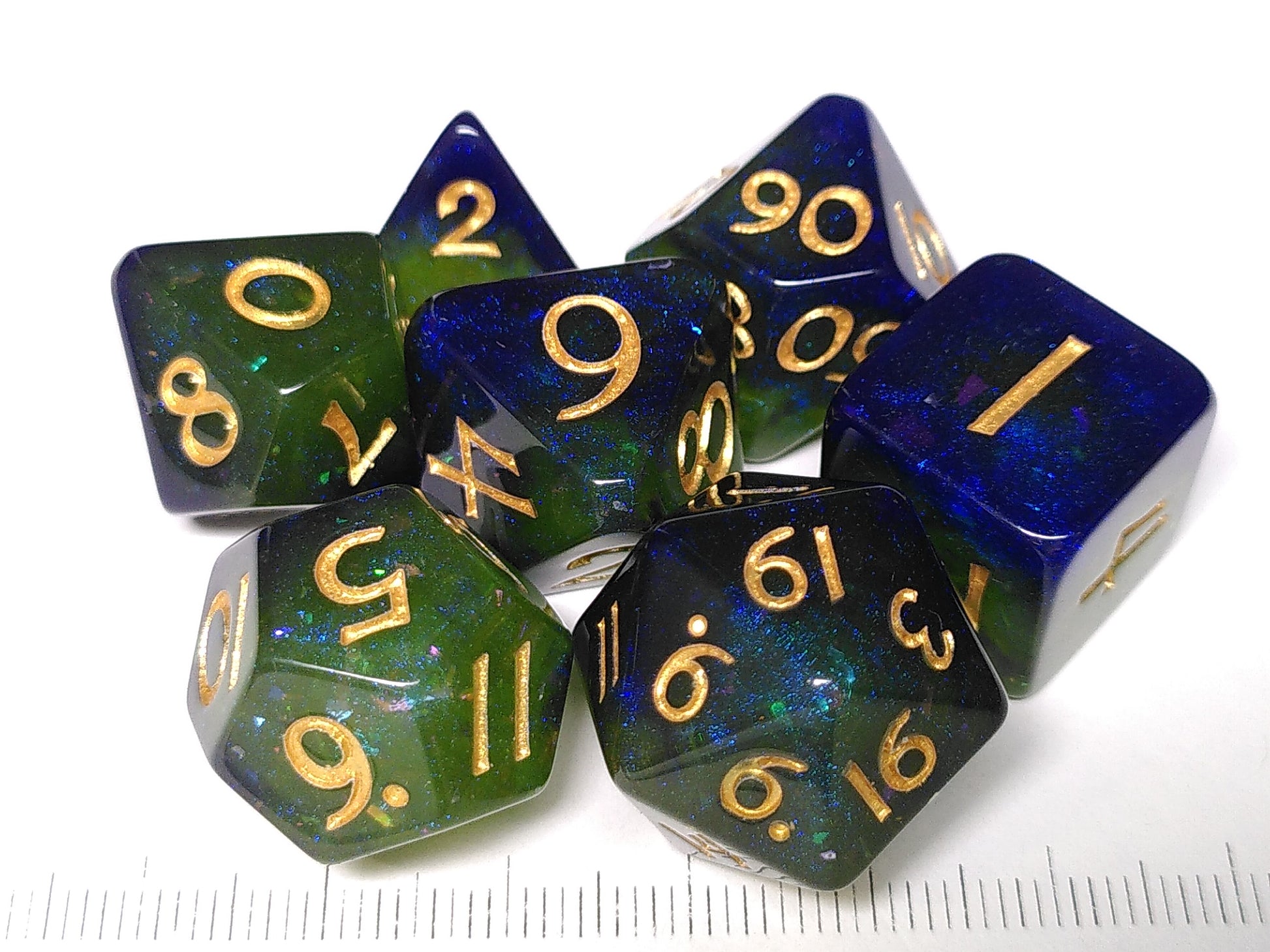 Een set semi-transparante paars-groene dobbelstenen, met multikleurige glitters en goudkleurige cijfers.