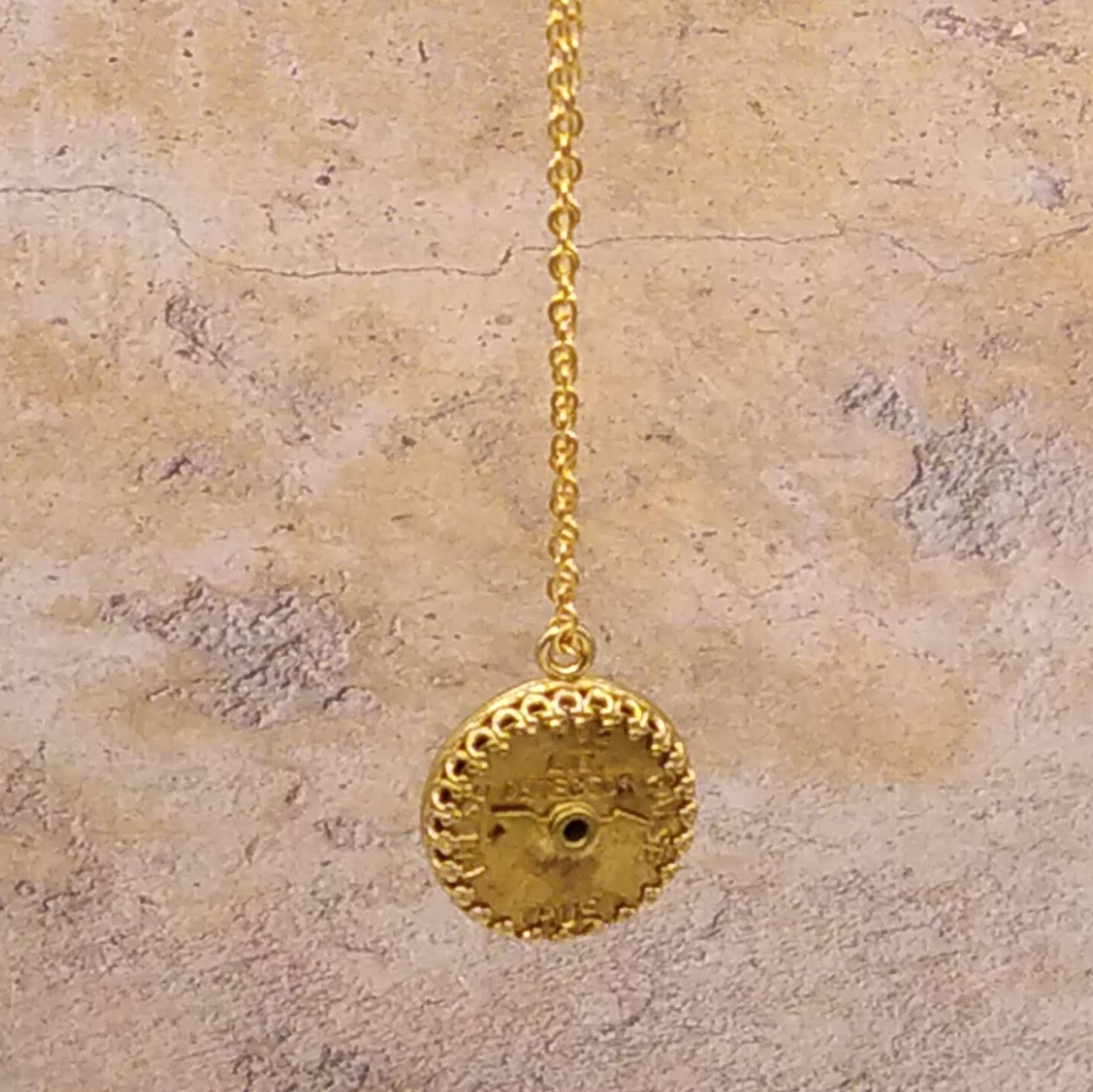 Een goudgekleurde metalen ketting met daar aan een kleine goudgekleurde hanger, de hanger heeft een wijzer die kan draaien en de woorden 'lie detector', 'true' 2x en 'false' 2x. aan de achterkant is een halve maan zichtbaar.