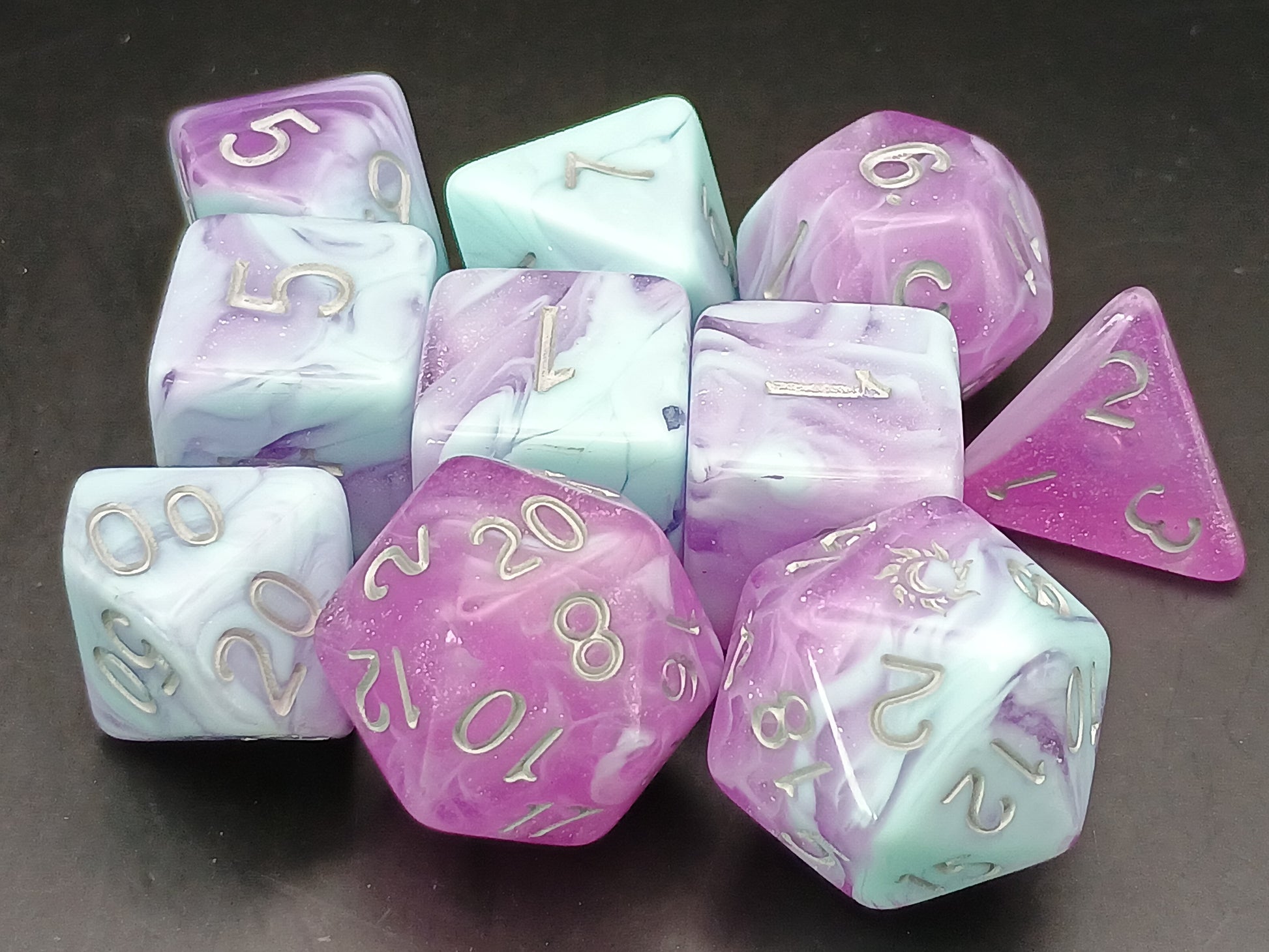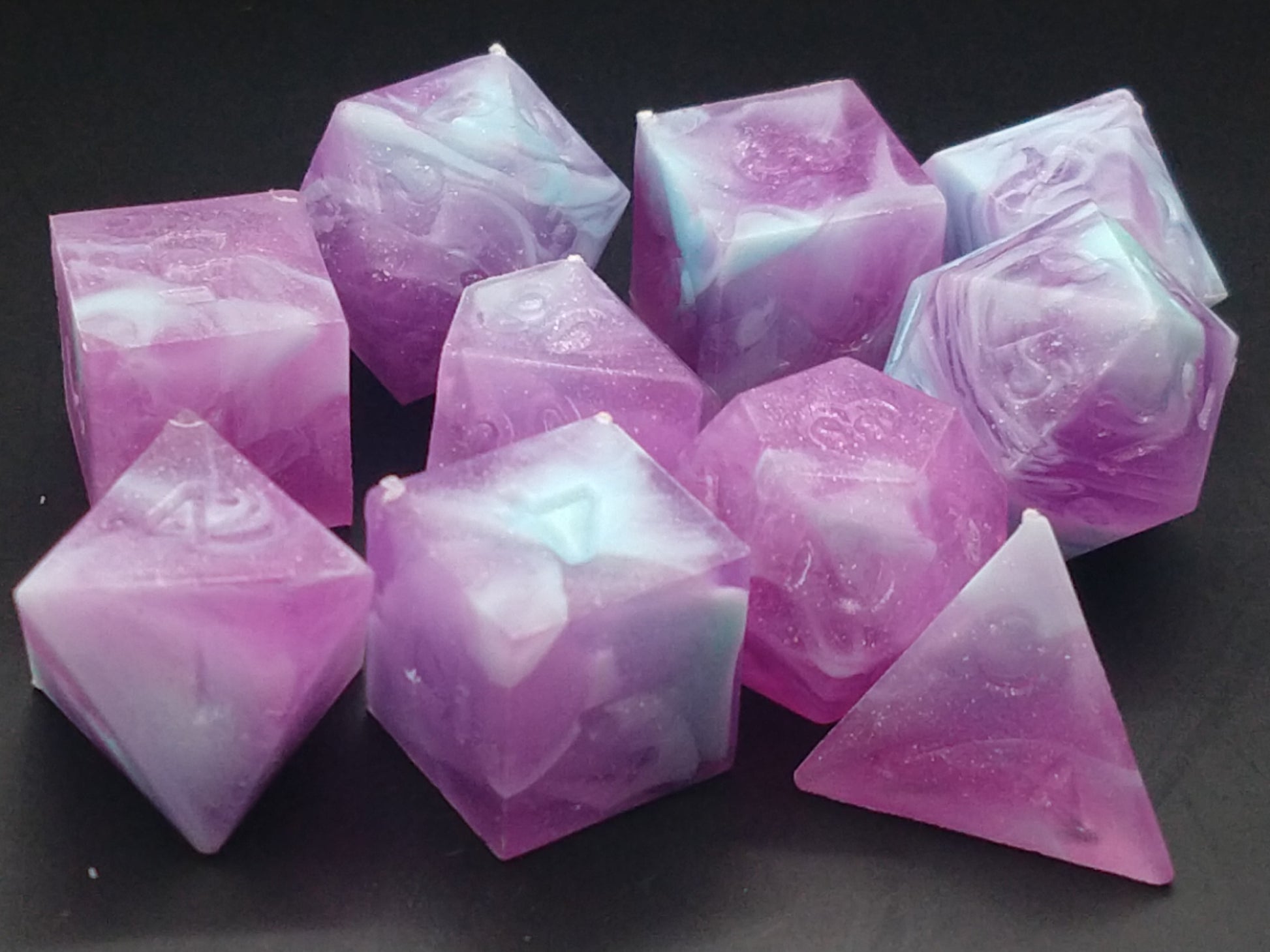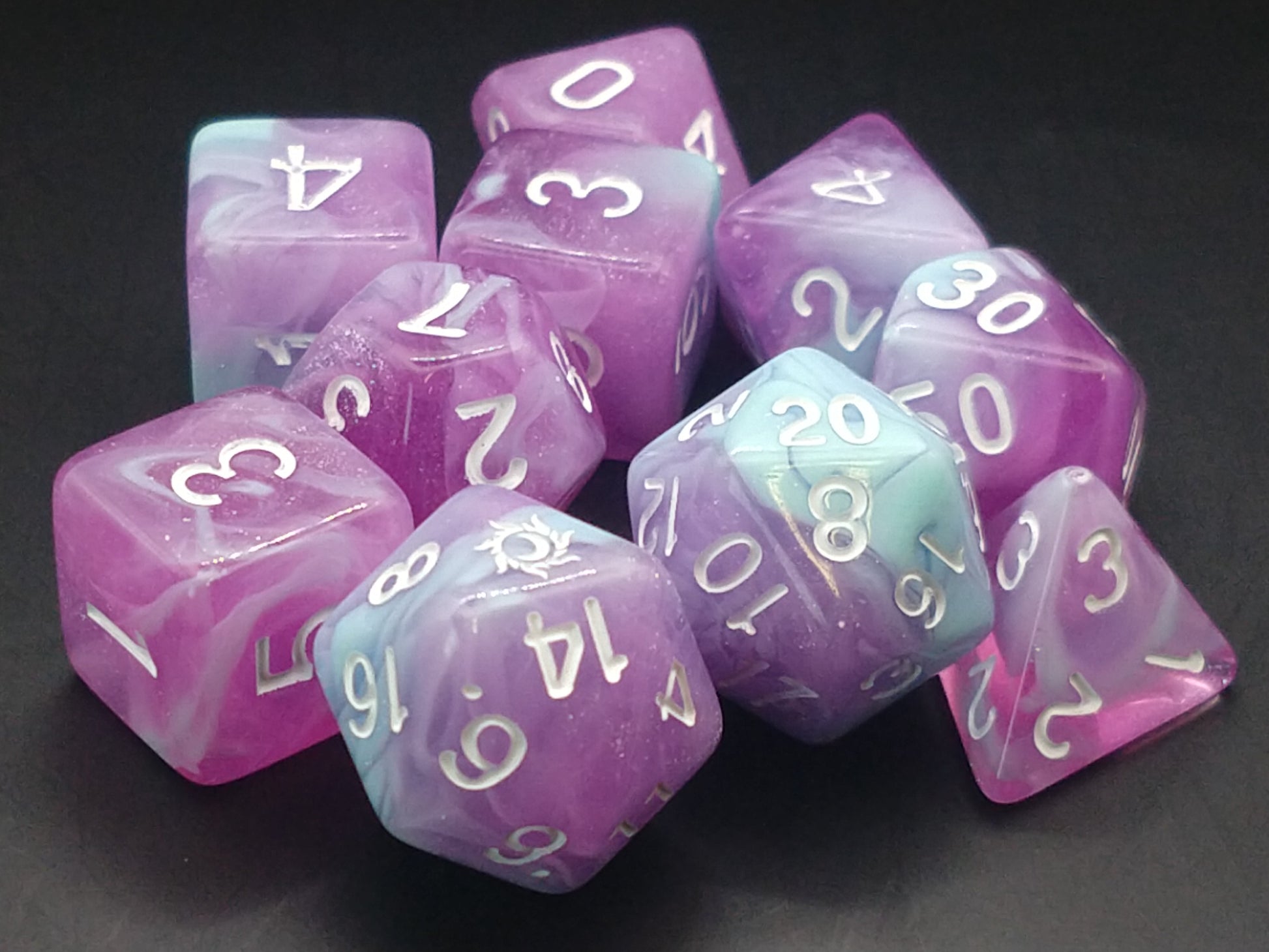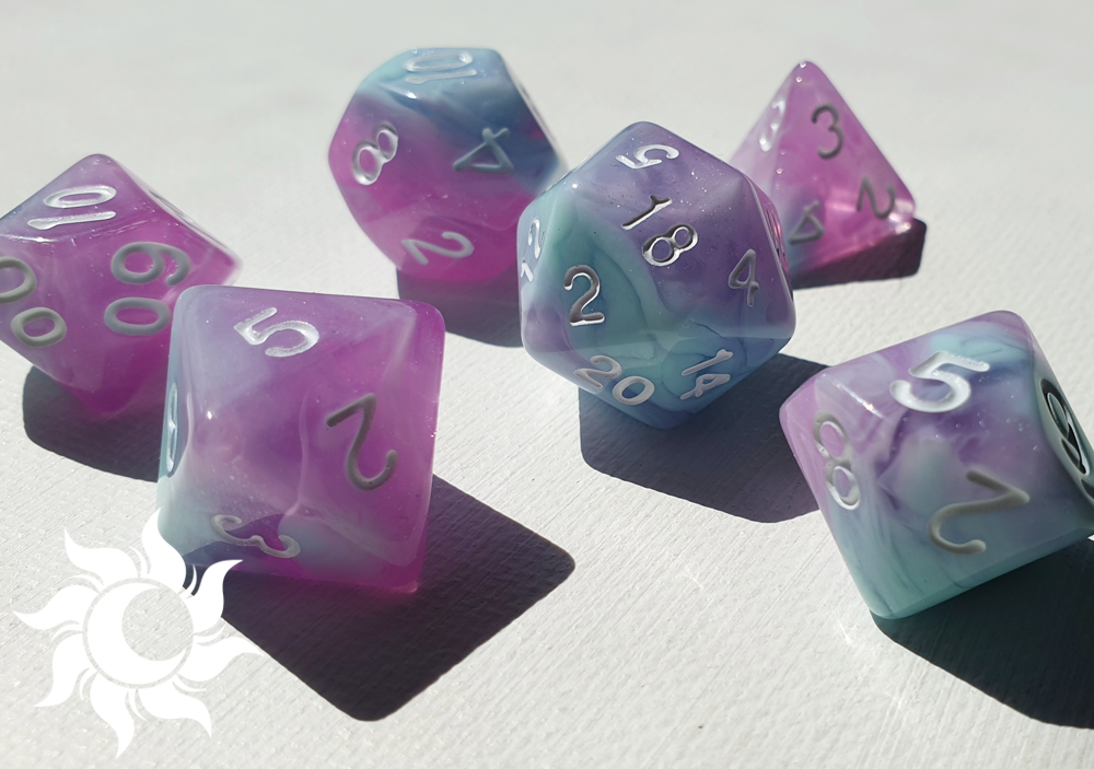 We wanted to create shimmery, swirly dice that captured the joy and spark that this anime brought to us. The design features opaque swirls in a shimmery translucent base. The darker the color of the translucent part, the less translucent it will be.