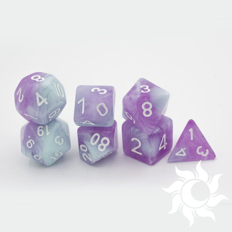 Distant Days is a mint, with purple translucent swirl dice set. Available in gold, silver and white ink options, as wel as a raw (uninked and unpolished) set.