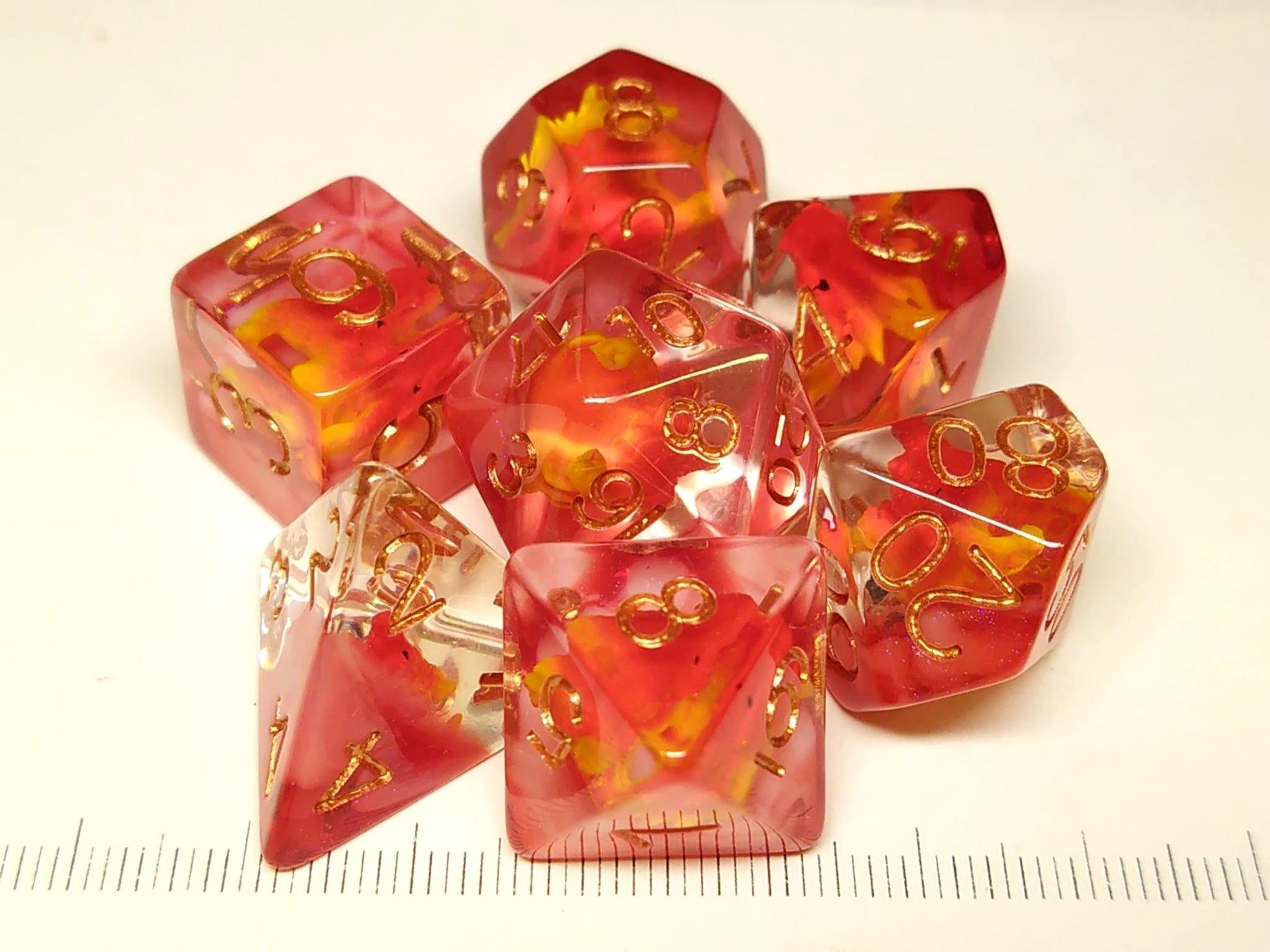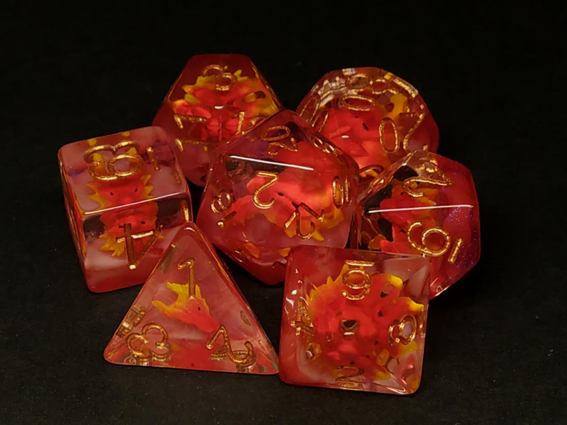 Een transparante set dobbelstenene met een laagje roze-rood resin, met daarop rustend een rood-geel figurtje van een drakenhoofd. Deze set heeft koperkleurige cijfers.