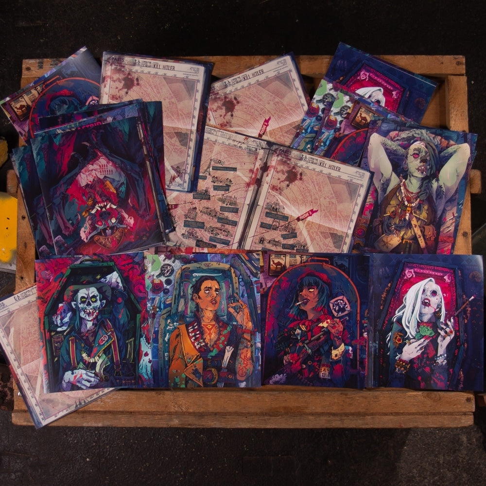 3 exemplaren van de zes prachtige personagebladen uit EAT THE REICH, afgedrukt op mooi papier, zodat je spelers er lekker op kunnen krabbelen zonder je boek te verpesten.