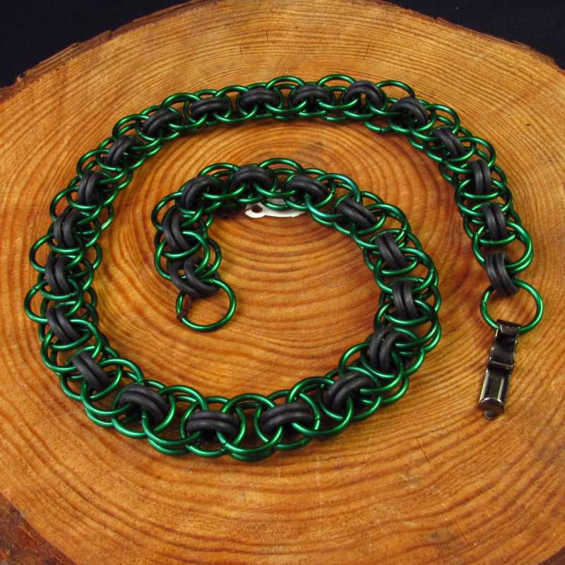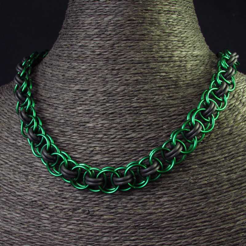 Een prachtige ketting gemaakt van groen aluminium en zwarte rubberen ringen in een Helms kettingweefsel.