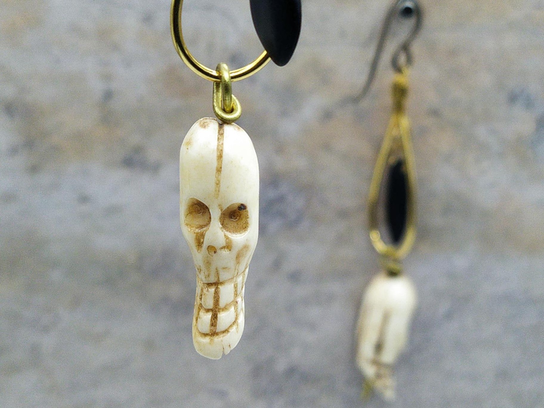 Twee zwart met goud gekleurde oorhangers met daaraan twee lange schedelvormige kralen van bot. De oorhaken zijn van Titanium.