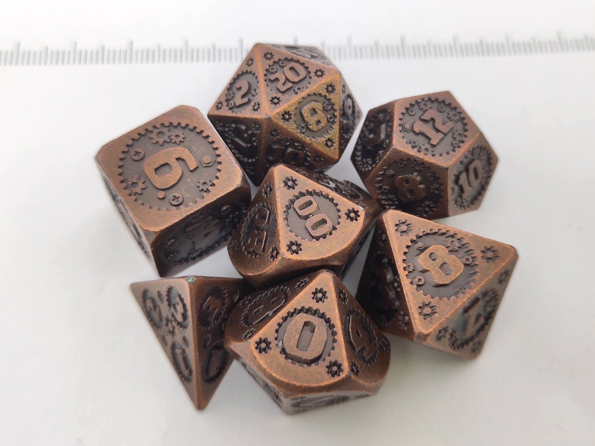 Een set van 7 koperkleurige metalen polydice met gegraveerde radaren, in een langwerpig zwart-rood doosje. (Deze is niet afgebeeld)