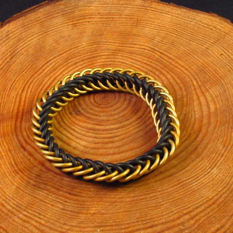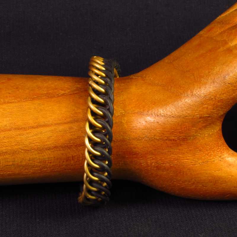 Een rekbare armband gemaakt met gekleurd aluminium en rubber, in een Perzisch patroon