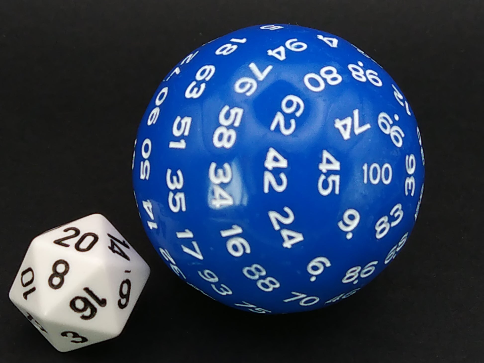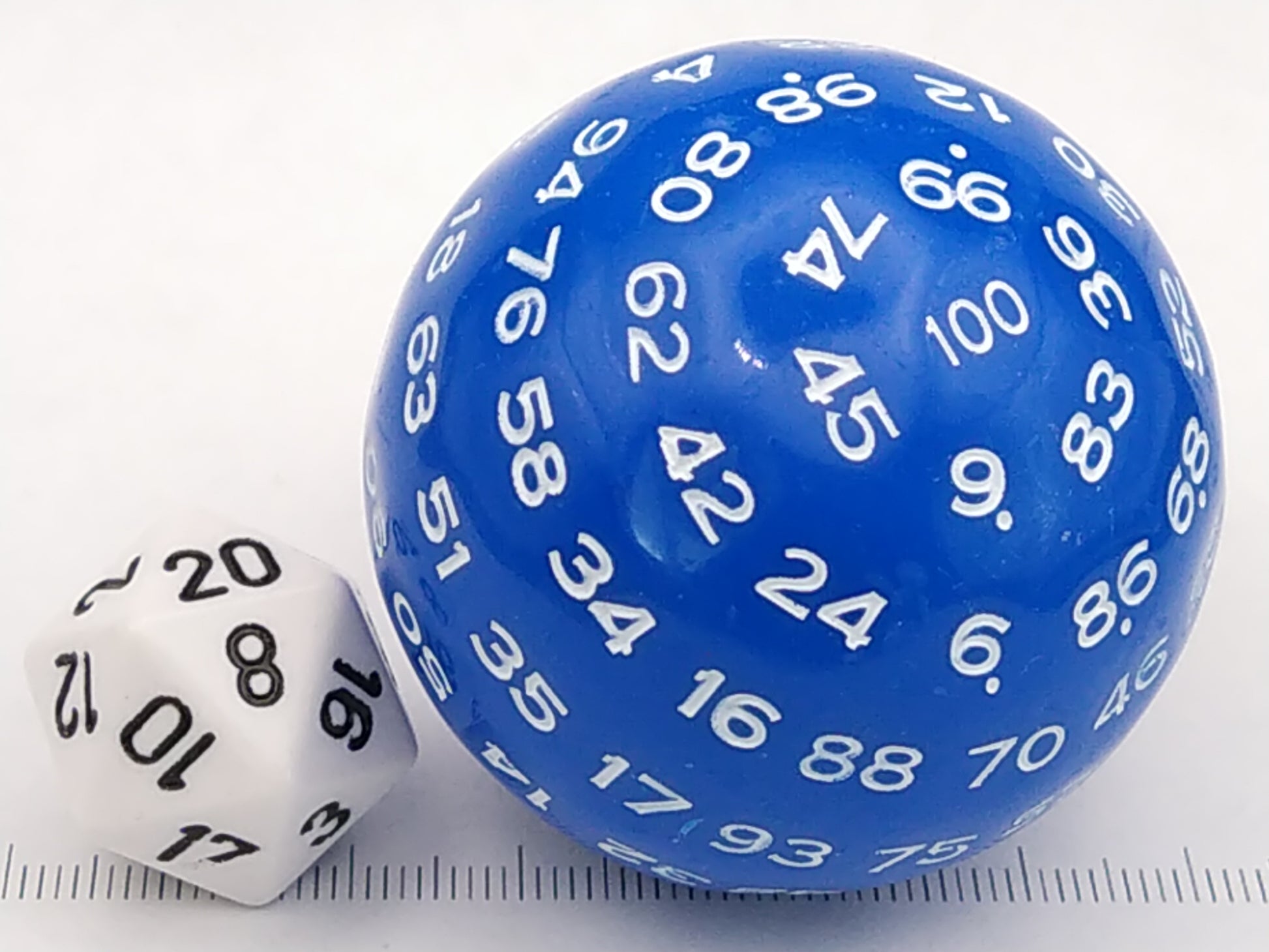 Een 100-zijdige dobbelsteen, blauw met witte cijfers.