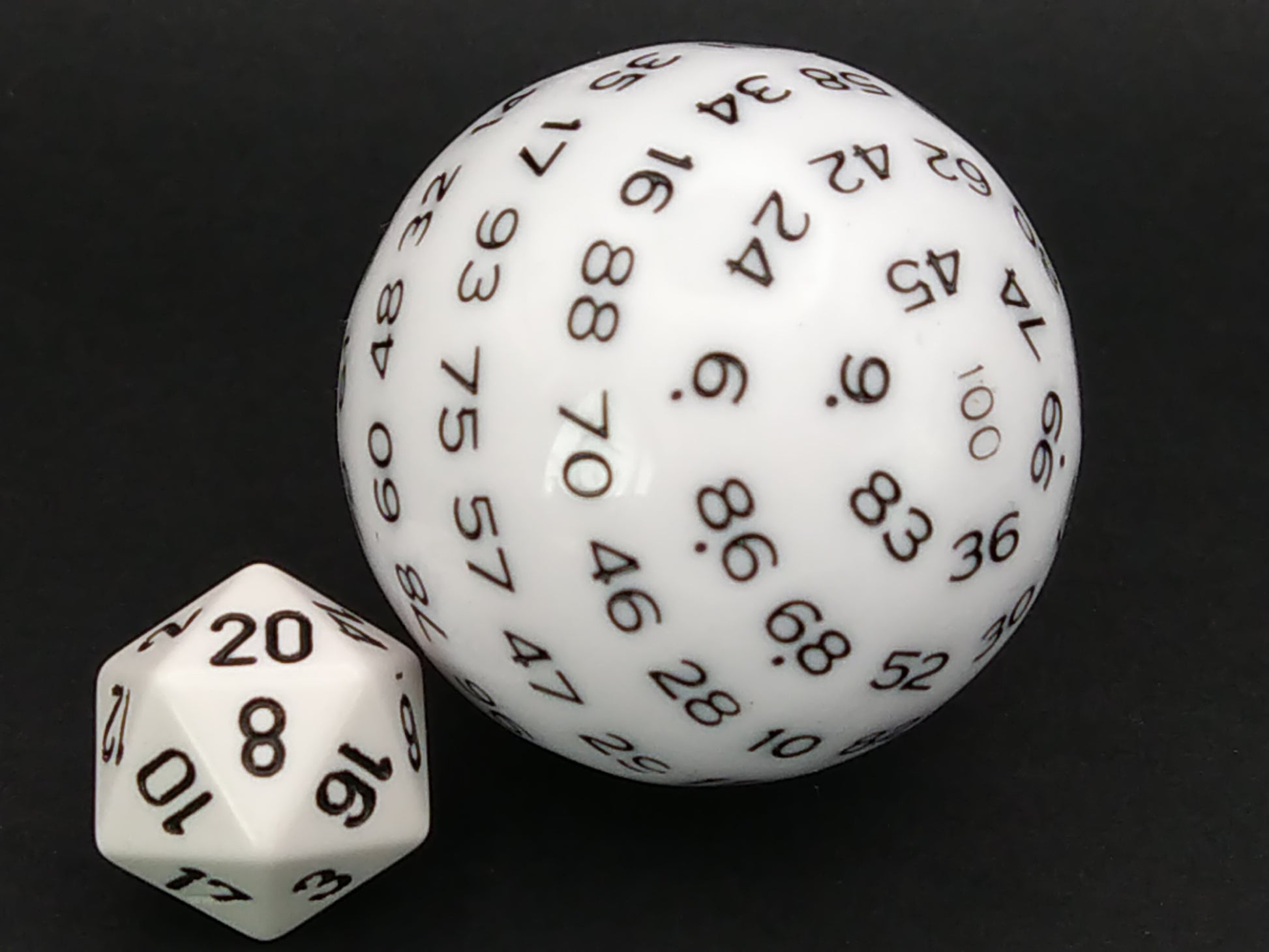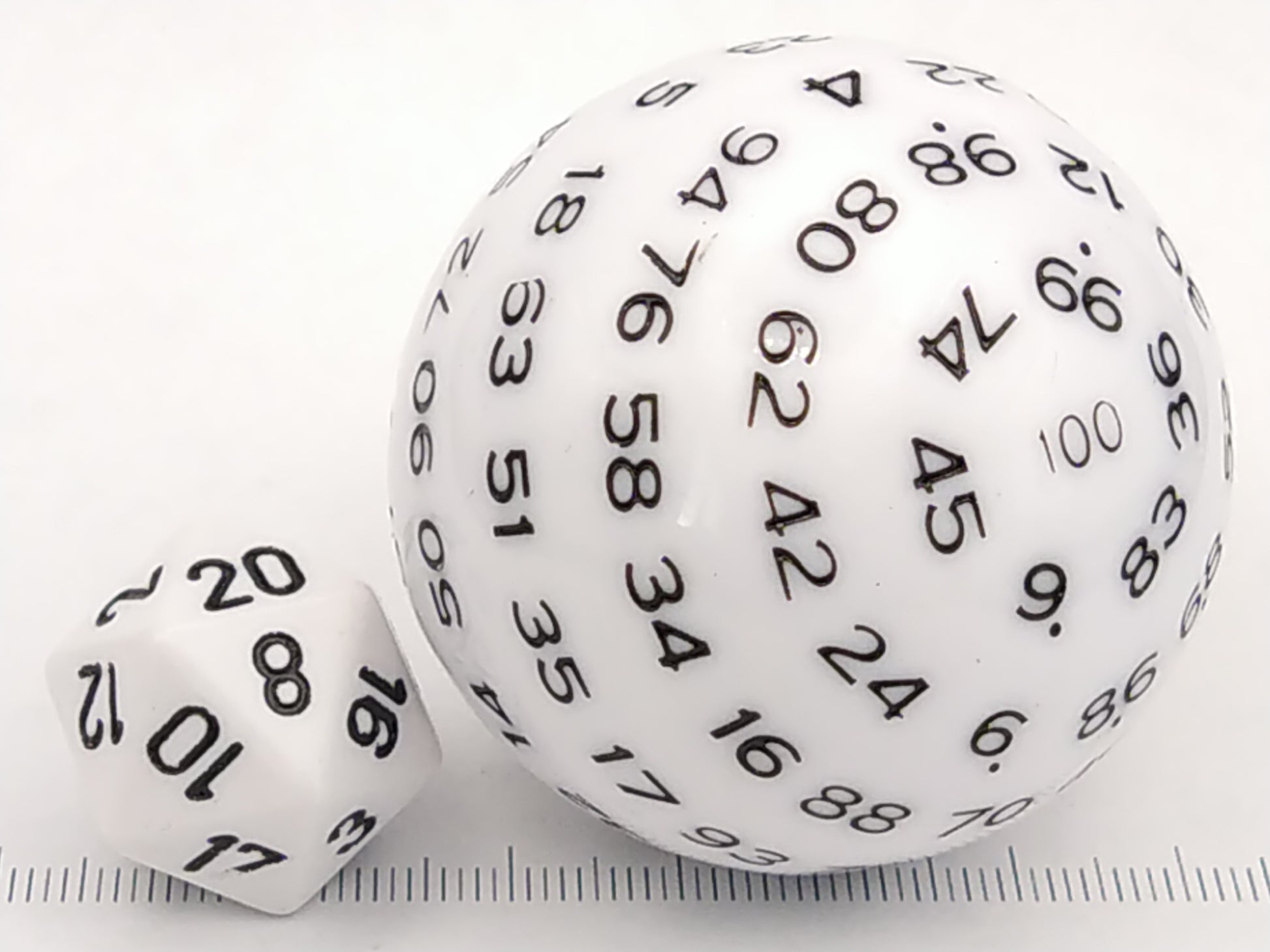 Een 100-zijdige dobbelsteen, wit met zwarte cijfers.