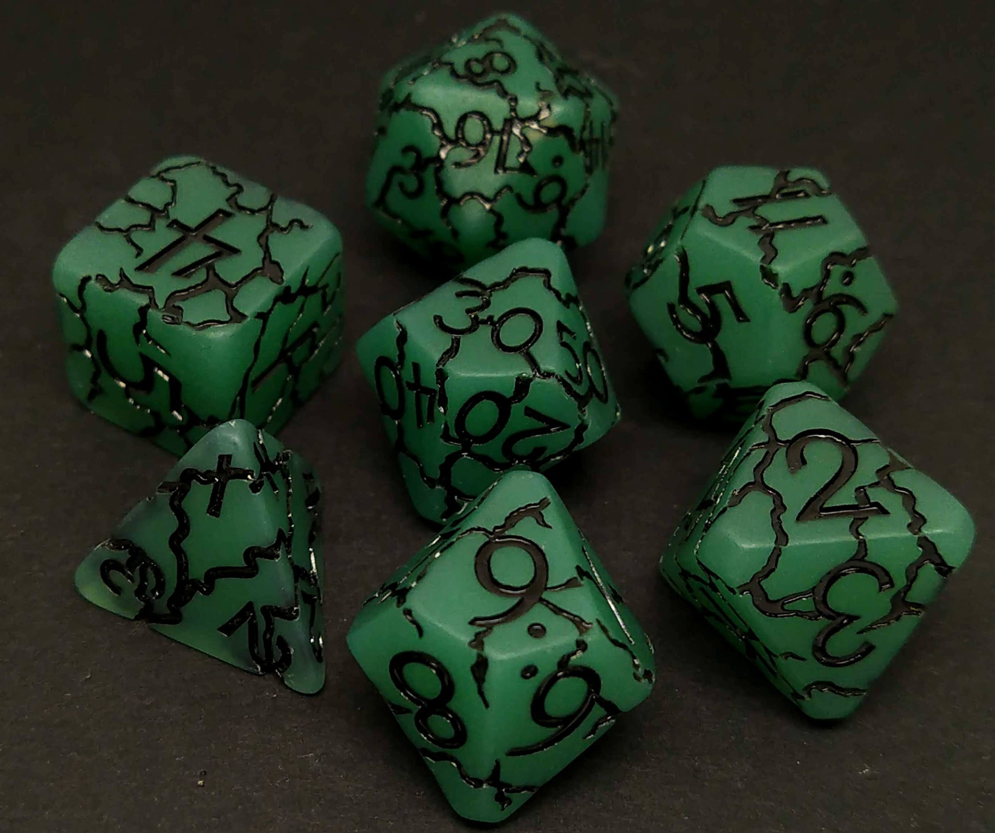 Een kunststof polydice set met groeven die het meest lijken op barsten in droge grond, deze set is grijs-groen van kleur met zwarte cijfers en groeven.