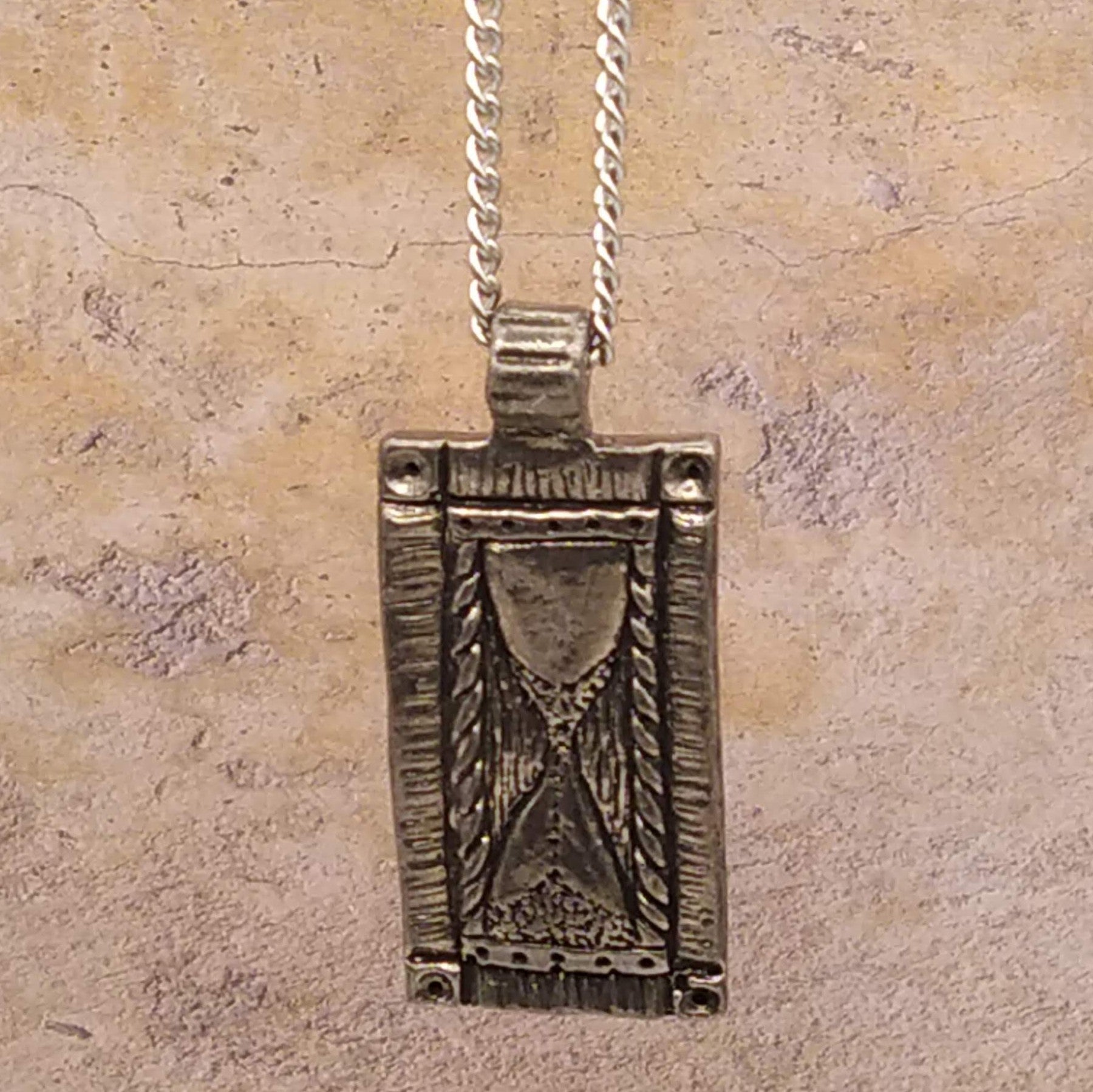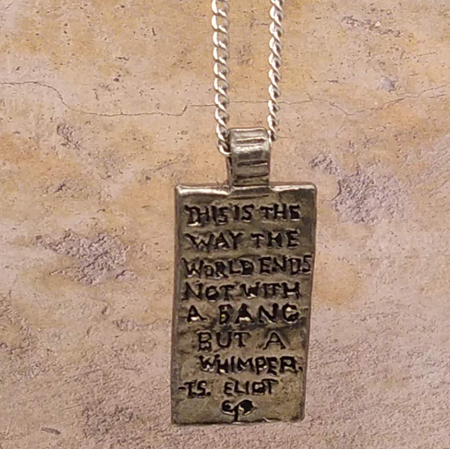 Een zilvergekleurde hanger met daarop het einde van het gedicht genaamd 'Hollow man' van T.S. Elliot: