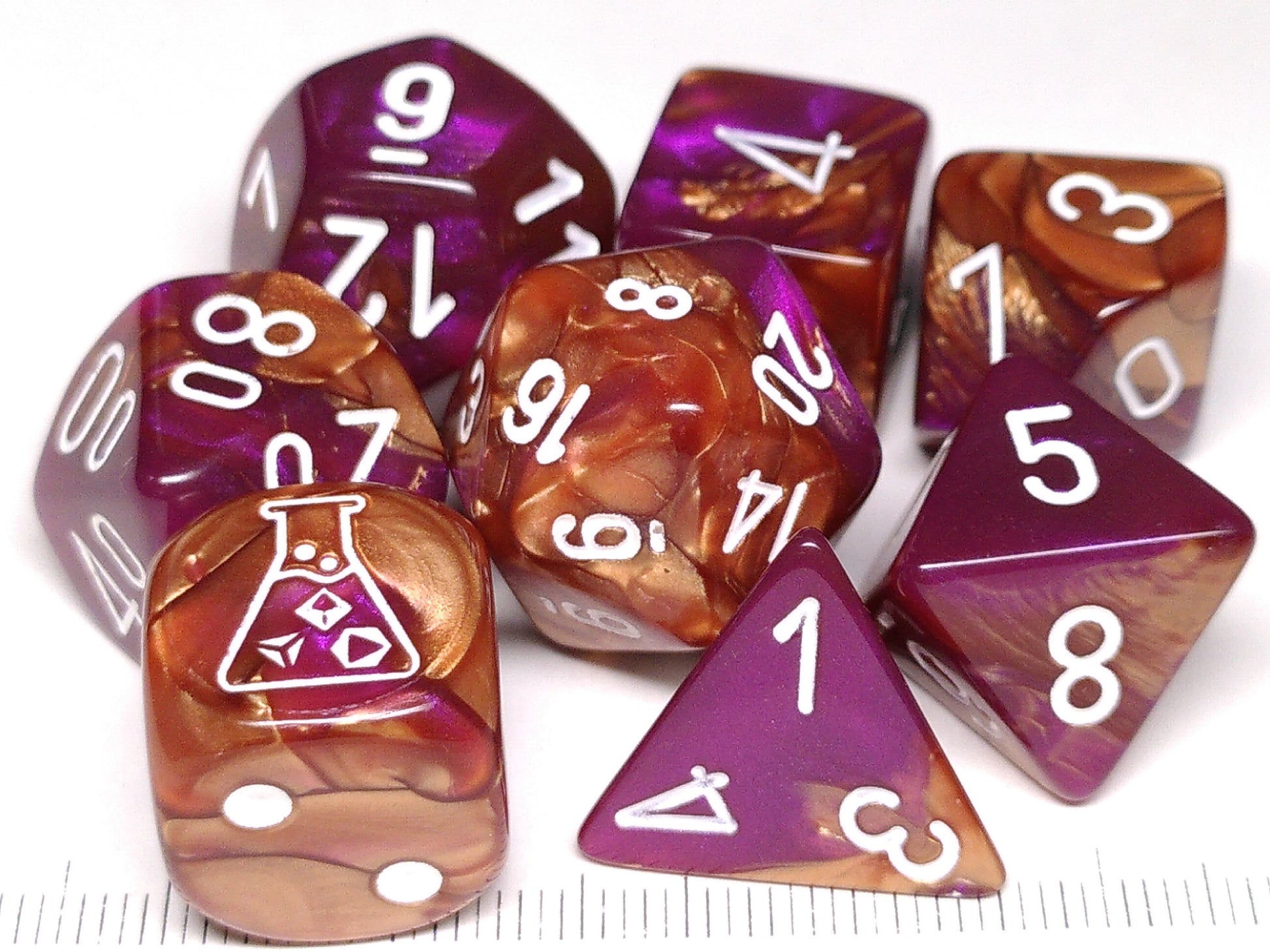 Een set van acht Chessex dobbelstenen, gemarmerd paars en koperkleurig.