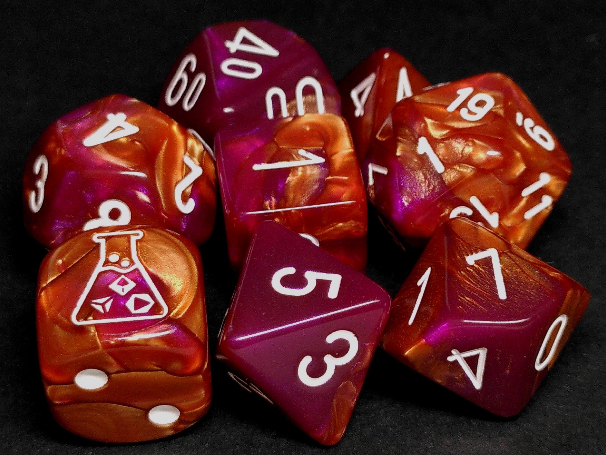 Deze set heeft een d6 met stippen en het Lab Dice logo, en daarnaast de zeven meest gangbare dobbelstenen, een elk van de volgende: