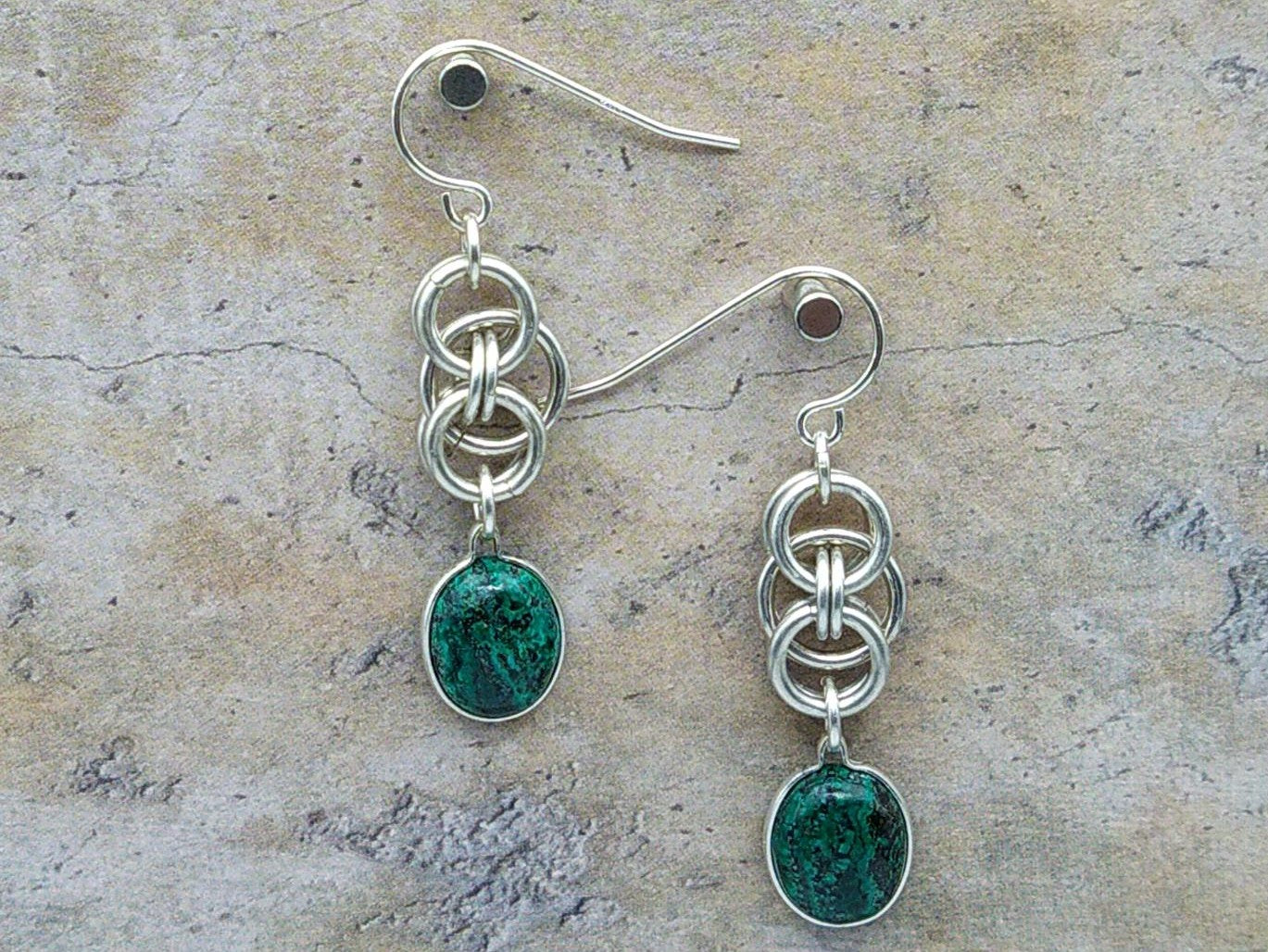 Twee stirling zilveren (925) oorbellen met twee stukken malachiet in de hangers.