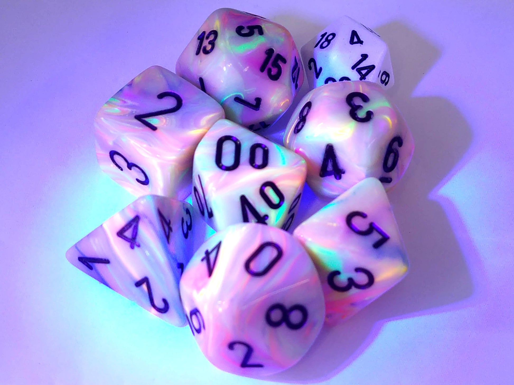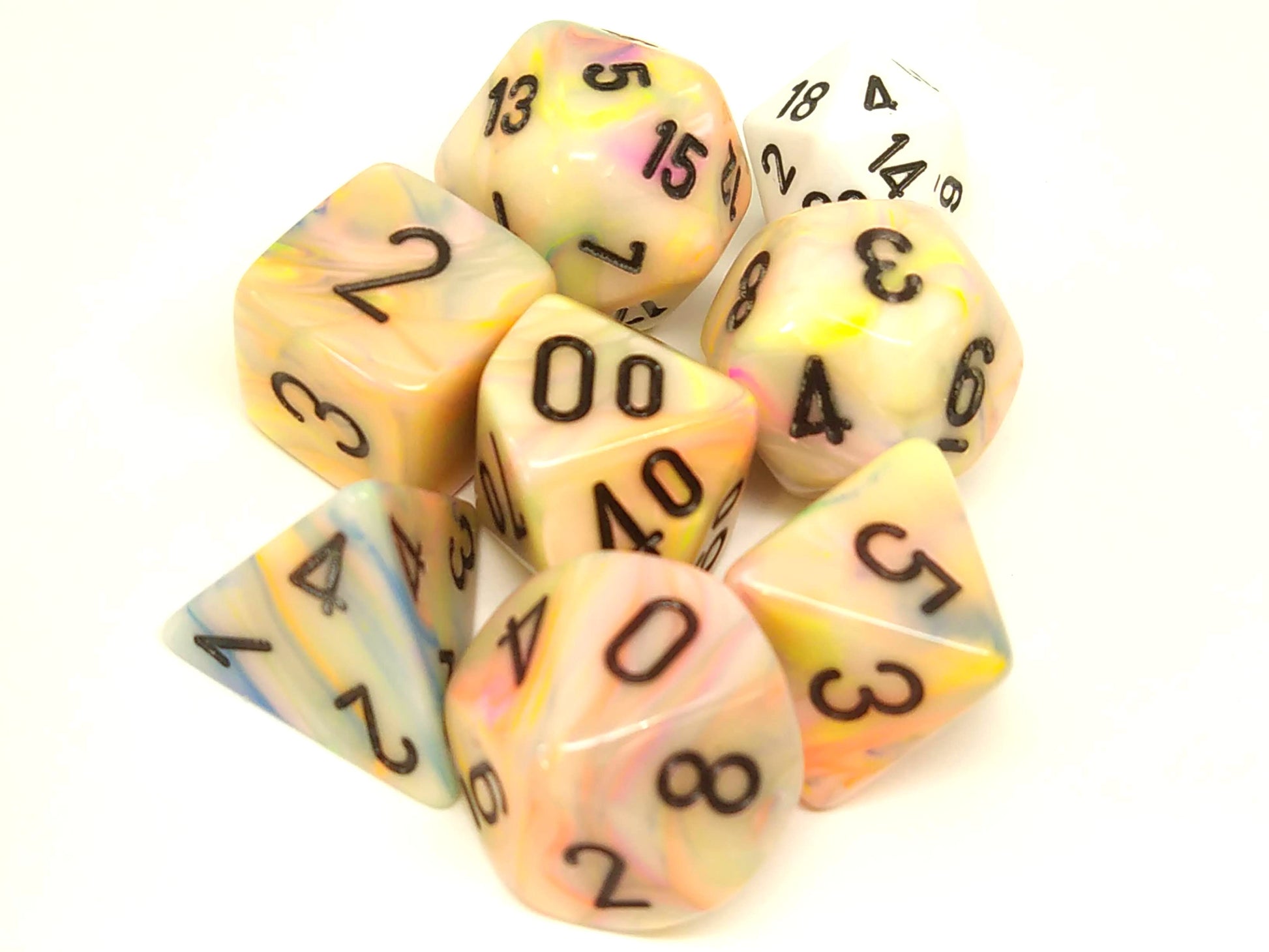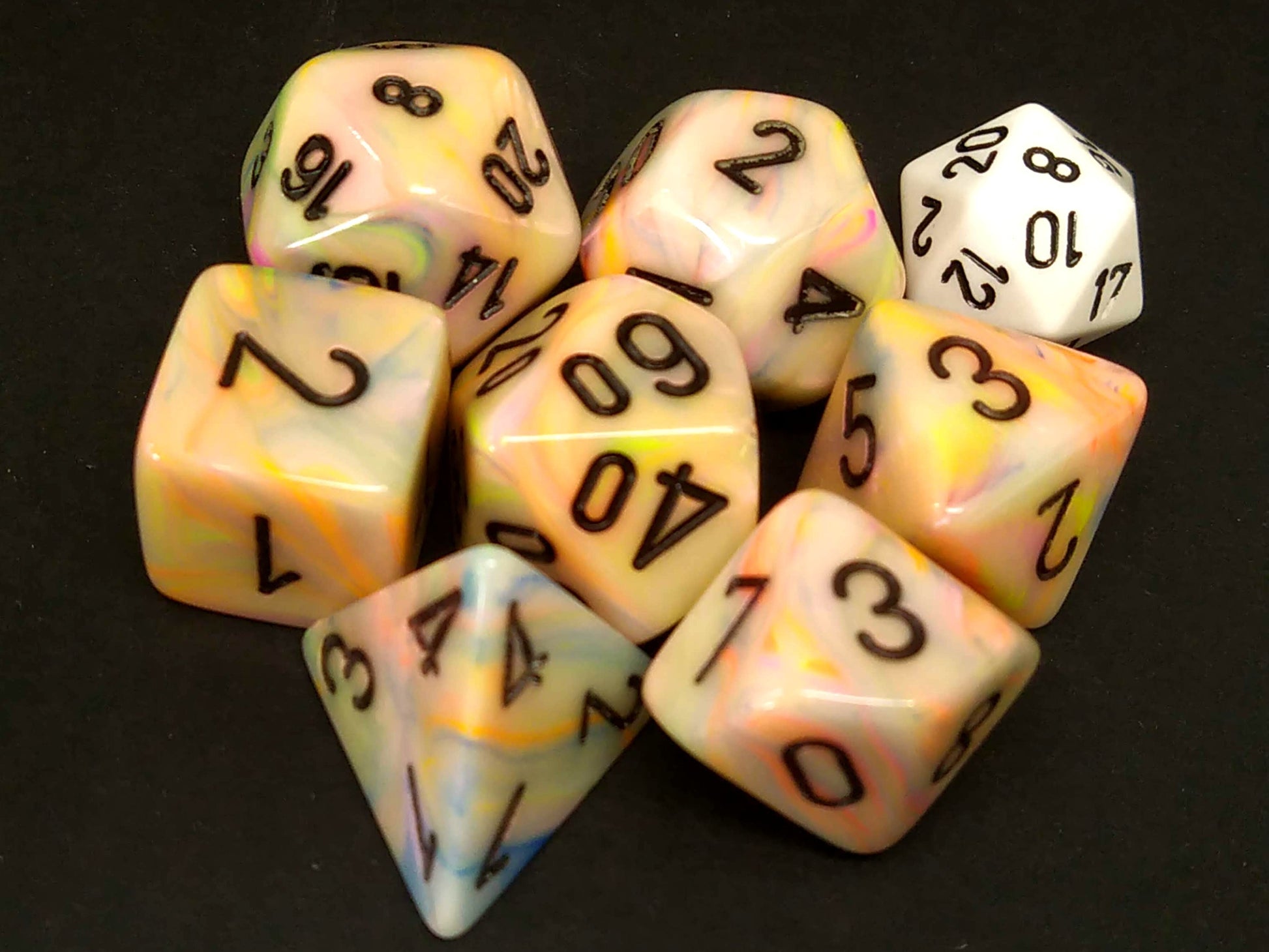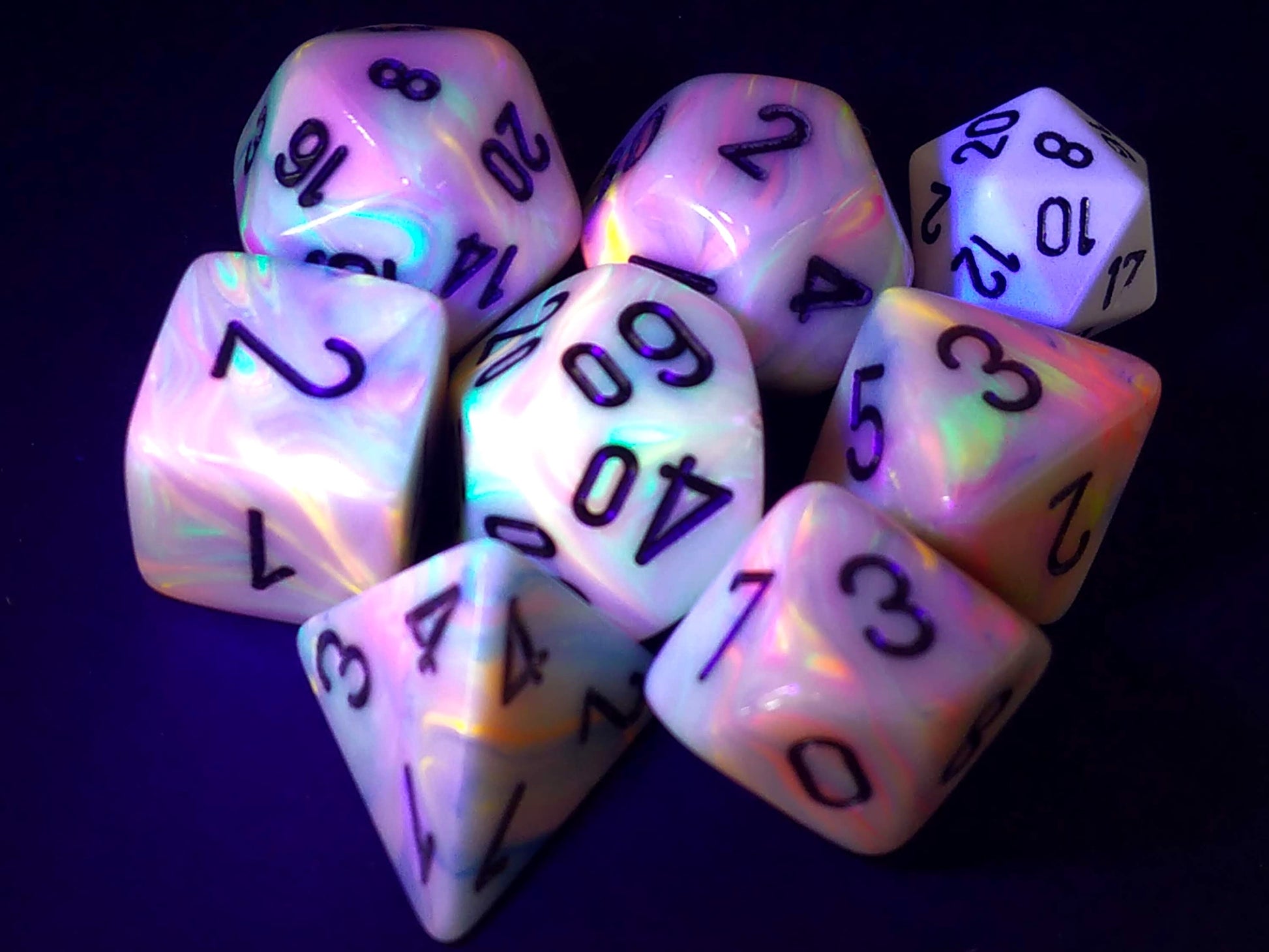 Een extra grote polydice set van 7 stuks van Chessex, gemarmerde pastelkleuren, met zwarte opdruk. Deze set licht op onder UV licht.