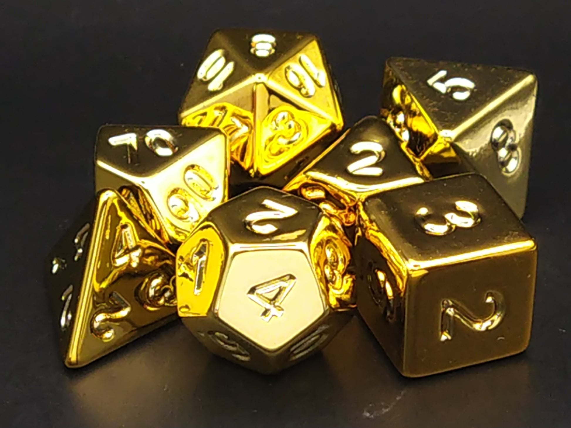 Deze goudkleurige dobbelsteenset ziet er uit als hoogglanzend metaal, maar is van kunststof! Deze kun je dus veilig rollen op je (houten) tafel, en wegen niet zo zwaar in je dobbelsteenbuidel als je voor je D&D sessie op pad moet.