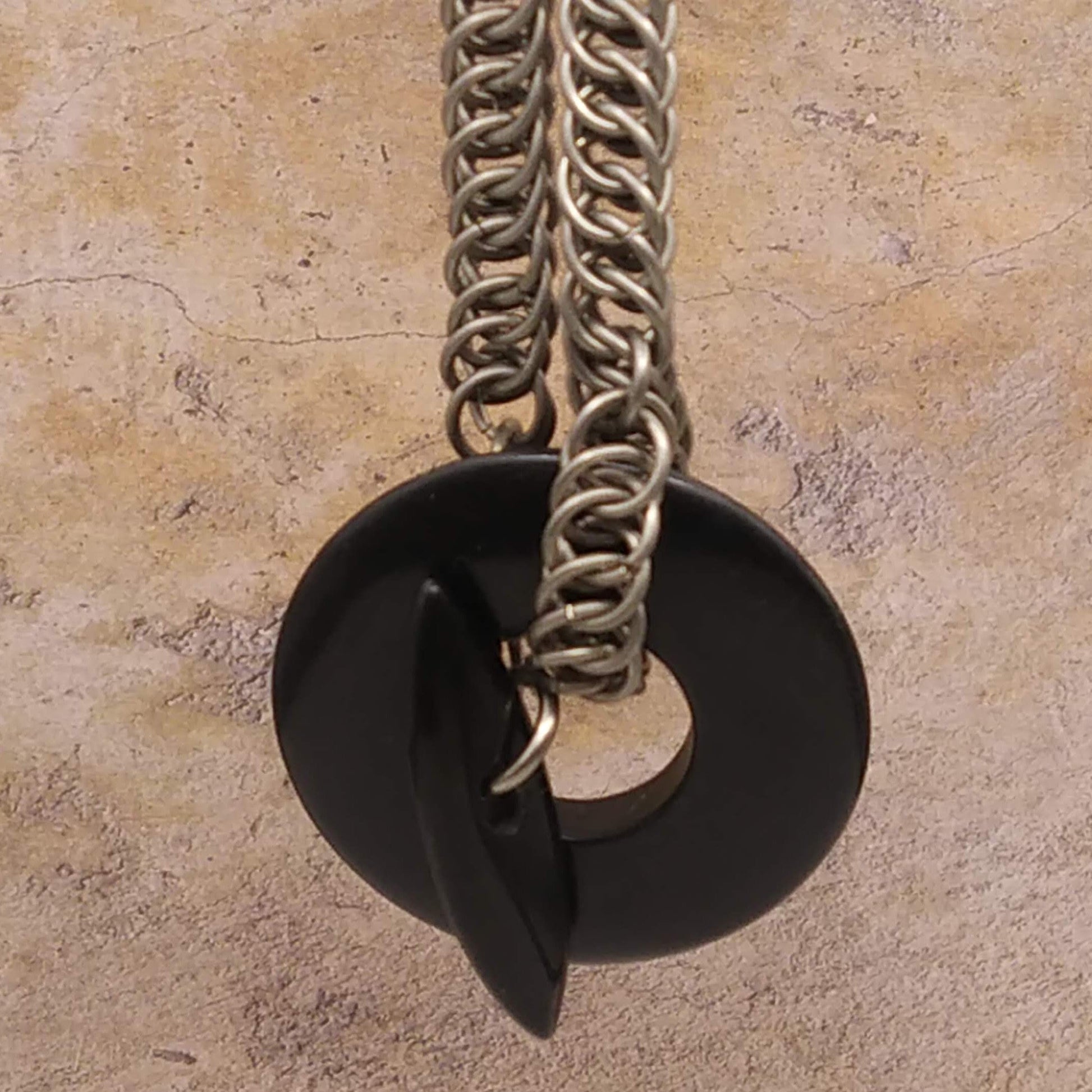 Een robuuste ketting die sluit met twee mat gepolijste zwarte stenen, een in de vorm van een donut en een in de vorm van een koffieboon.
