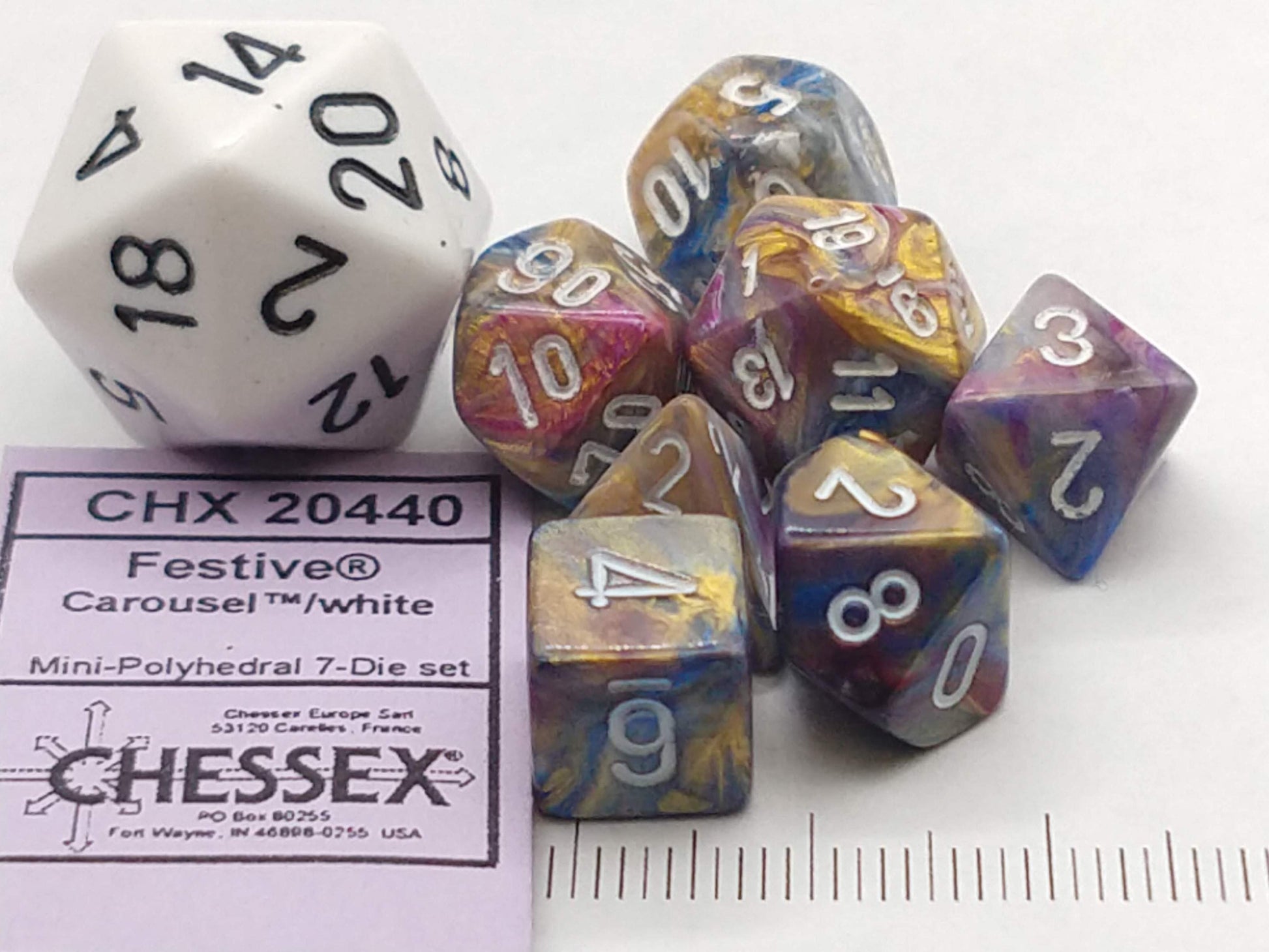 Een set van zeven mini Chessex dobbelstenen in gemarmerde iriserende kleuren, met witte opdruk.