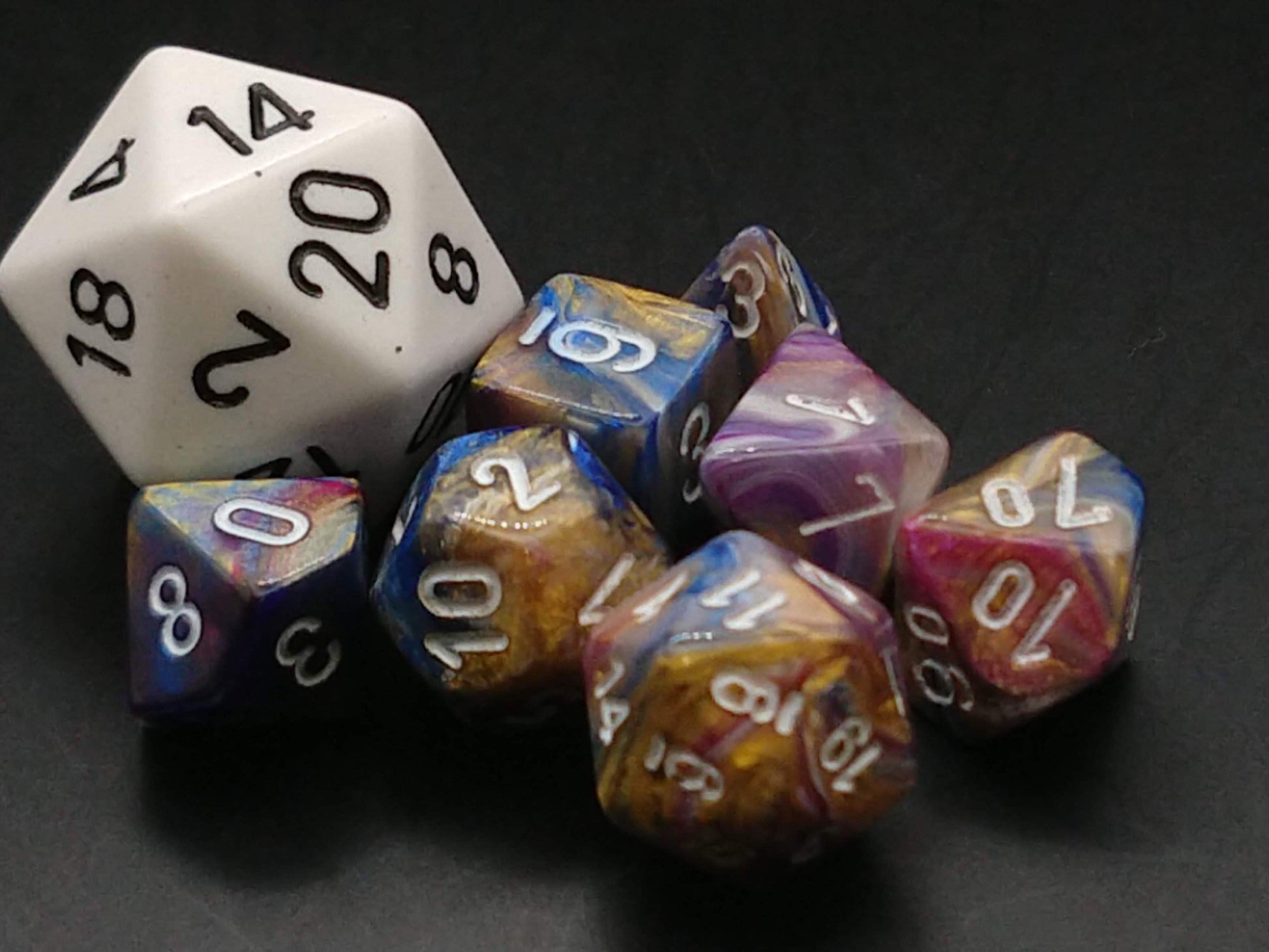 Deze set bevat de zeven meest gangbare dobbelstenen, een elk van de volgende: