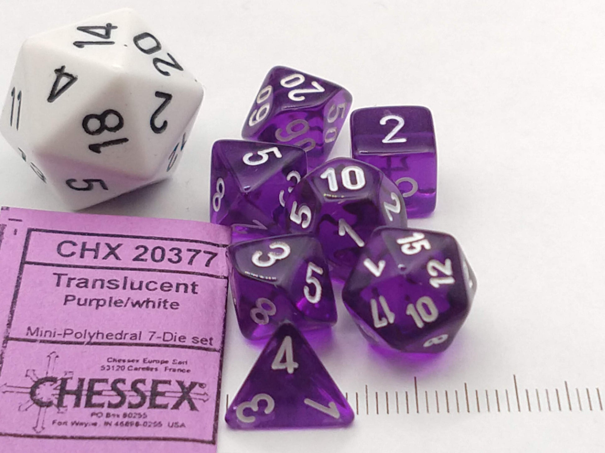 Een set van zeven mini Chessex dobbelstenen, transparant paars met witte opdruk.Â