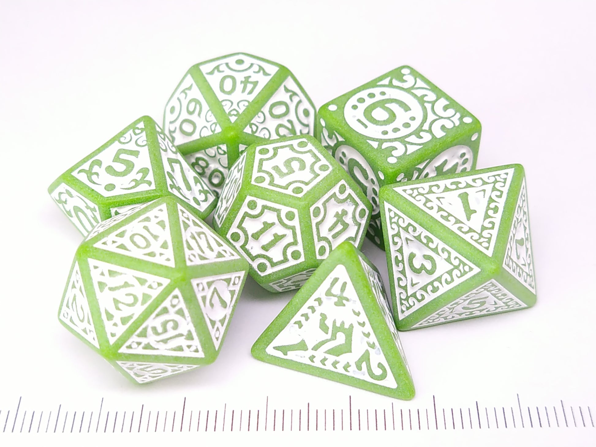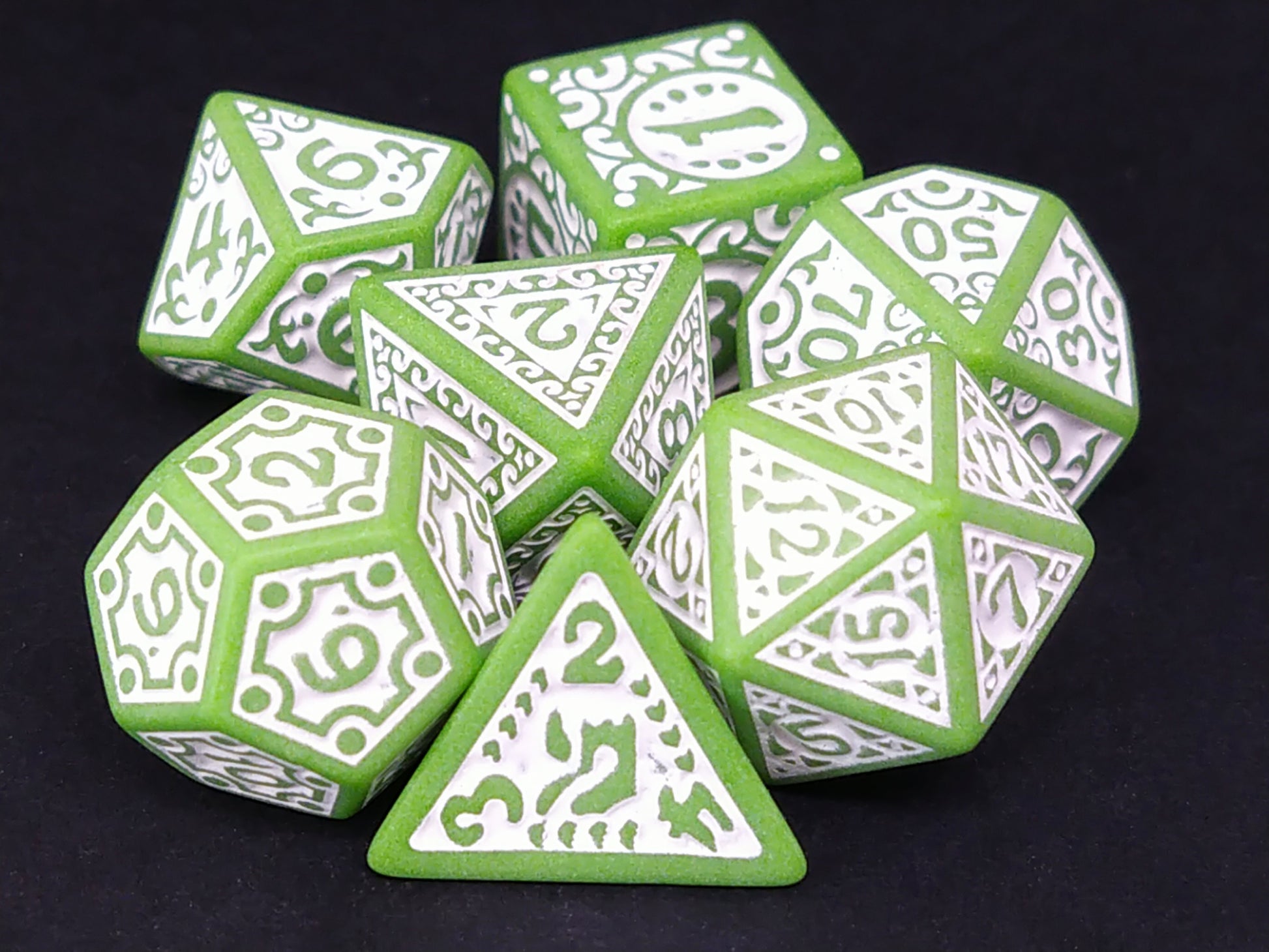 Een set groene dobbelstenen met witte, in relief gedecoreerde vlakken.